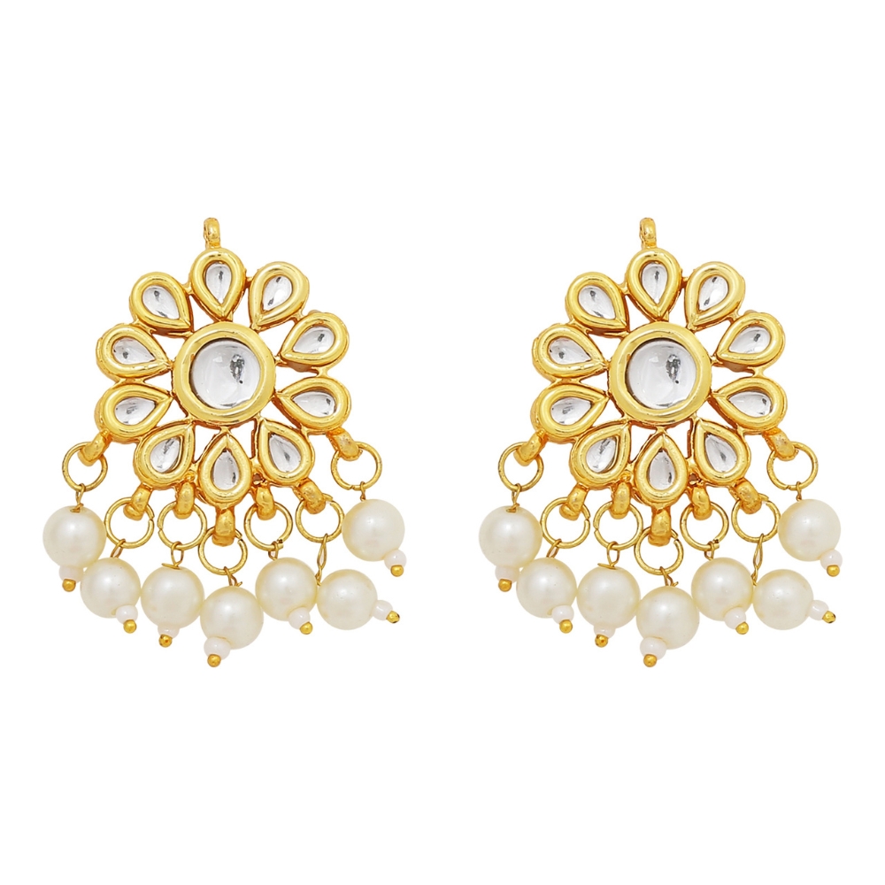 The Handcrafted Floral Kundan Pearl Drop Earrings bring together delicate artistry and timeless Indian jewelry design. Crafted in polished golden brass, these earrings feature a graceful floral motif highlighted with Kundan style stone settings. A single pearl drop adds subtle movement and refined elegance to the overall design. With their compact 1.5 inch silhouette, this handcrafted pair offers a sophisticated accent for both festive and everyday traditional styling.