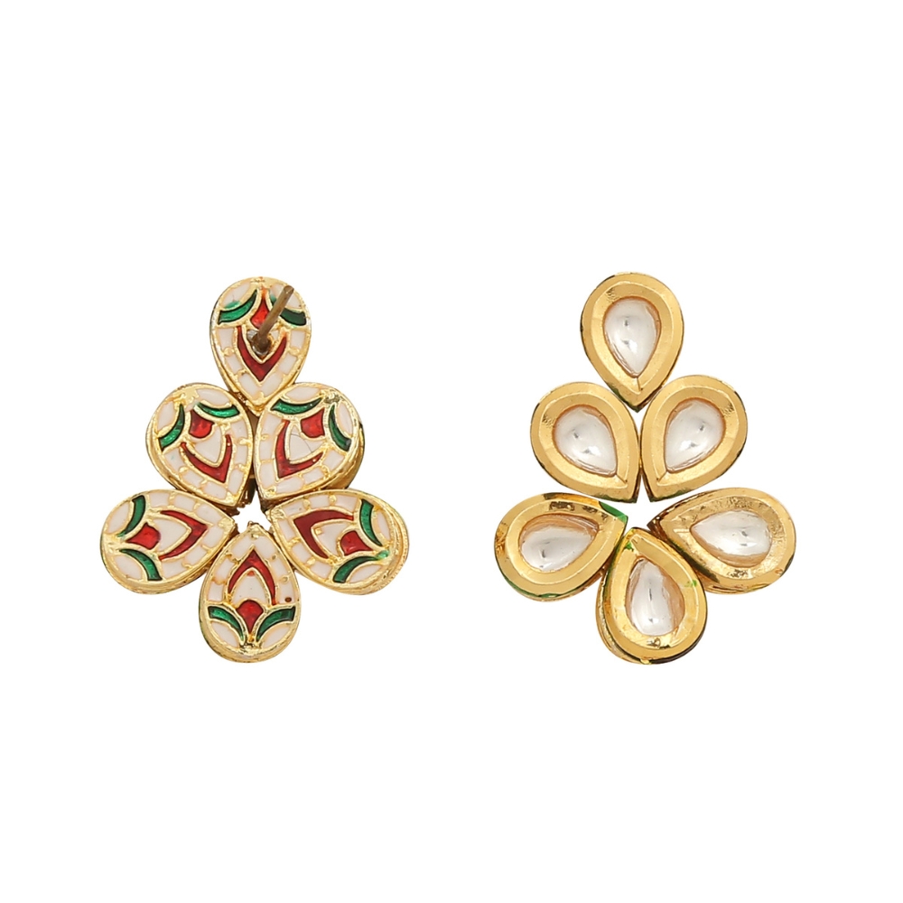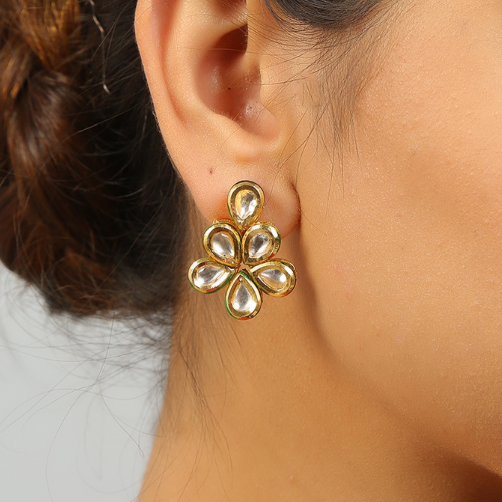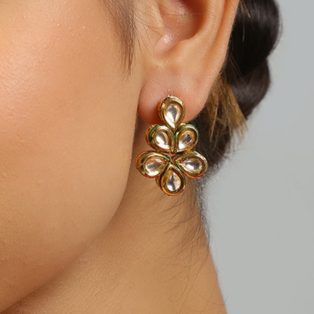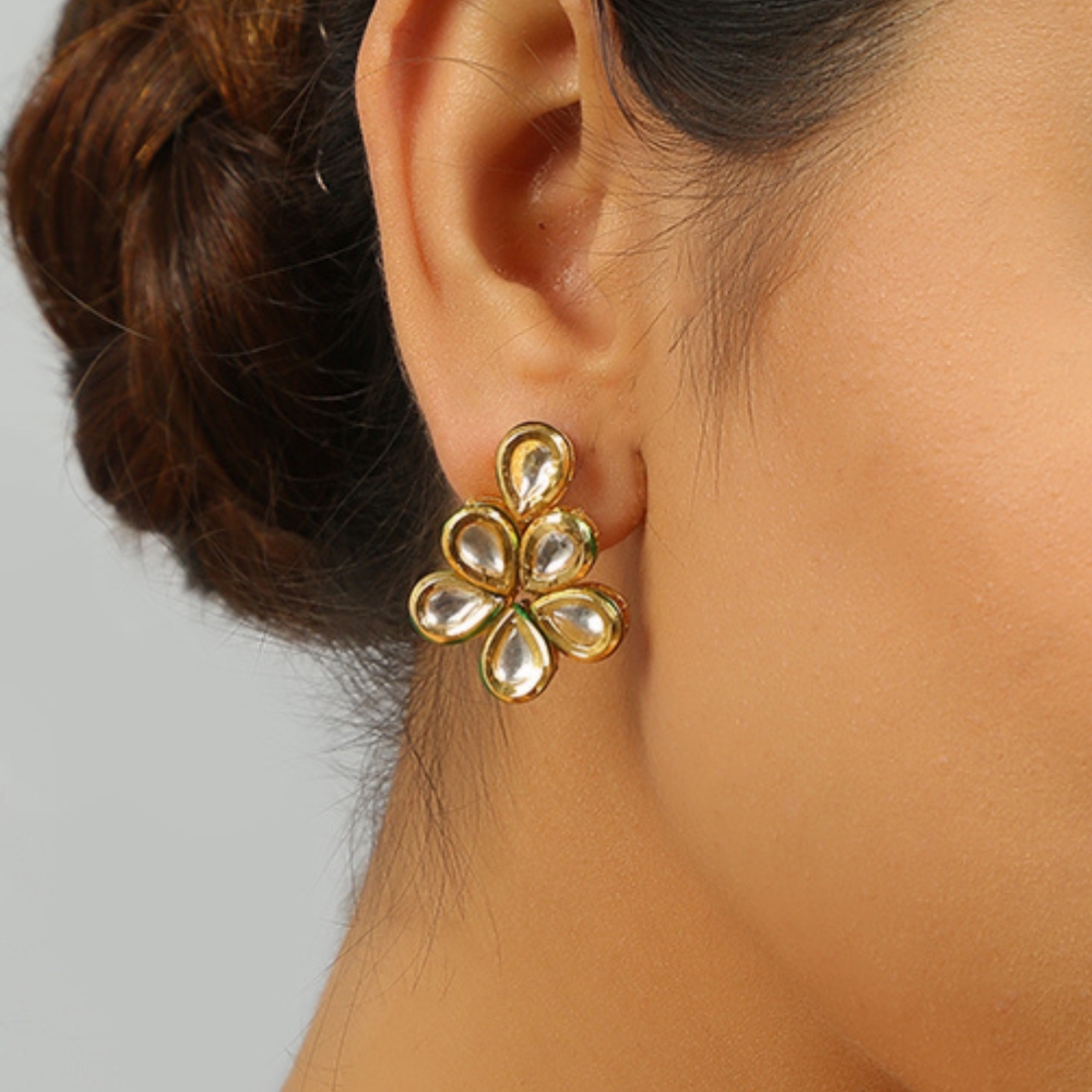 These handcrafted stud earrings showcase a floral arrangement of kundan elements, offering a balanced blend of tradition, symmetry, and understated luxury.