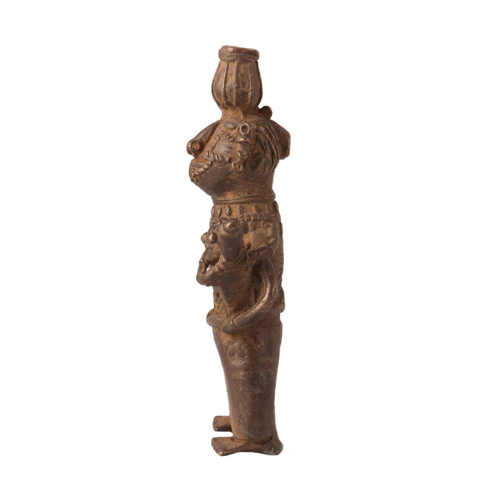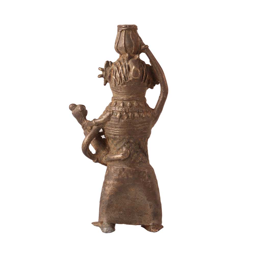 This folk brass statue depicts a woman carrying her child with one hand and a water pot on her head. Made of high quality brass, this statue depicts a tribal woman wearing 3 nose plugs, earrings and necklace. This statue is handcrafted by skilled artisans from Bengal in tribal folk art with a brown antique finish. Place this tribal art statue on a table, shelf or desk to make a remarkable impression on your guests and visitors at home, restaurant, hotel, office or store. This brass statue is made with intricate details, making it an endearing gift for your loved ones for special and festive occasion.