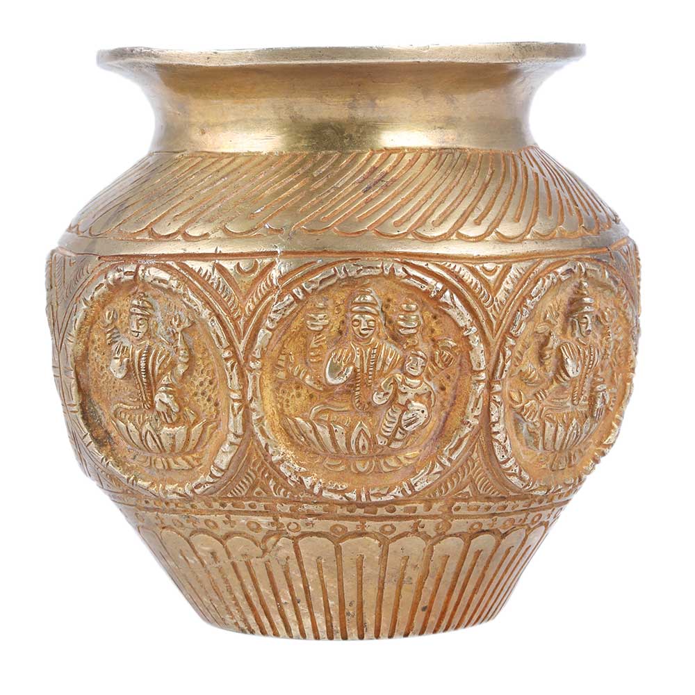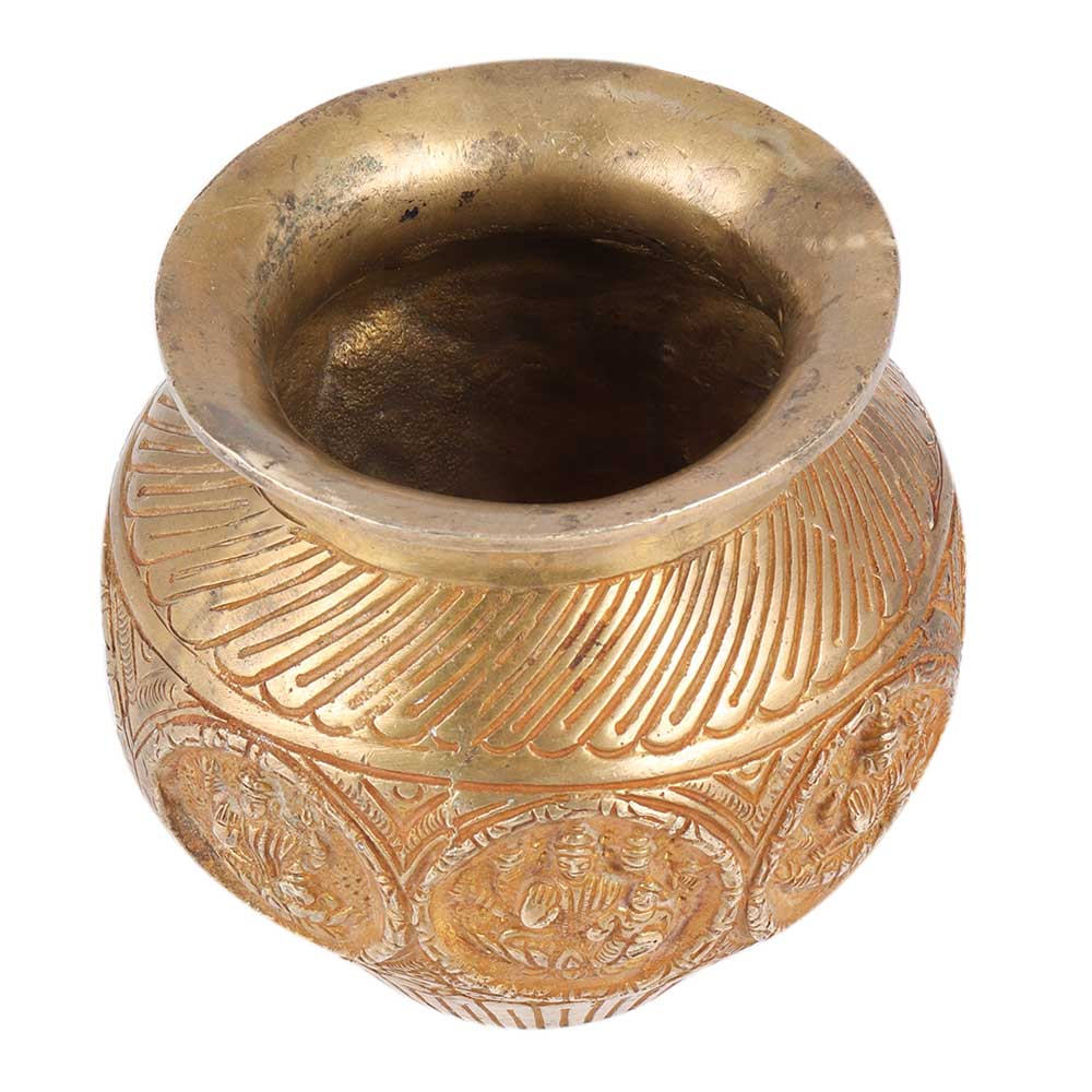 Handcrafted Golden Brass Holy Water Pot Carved With Goddess Laxmi Images
