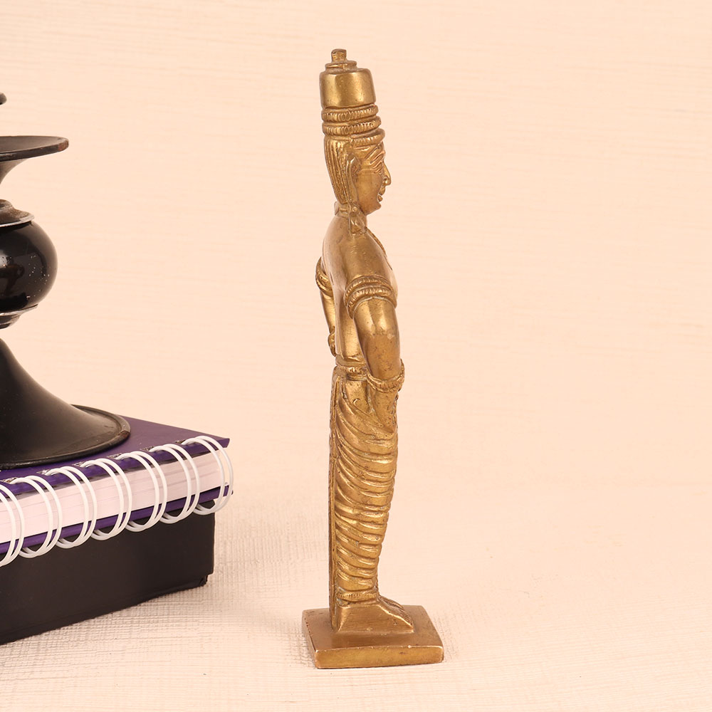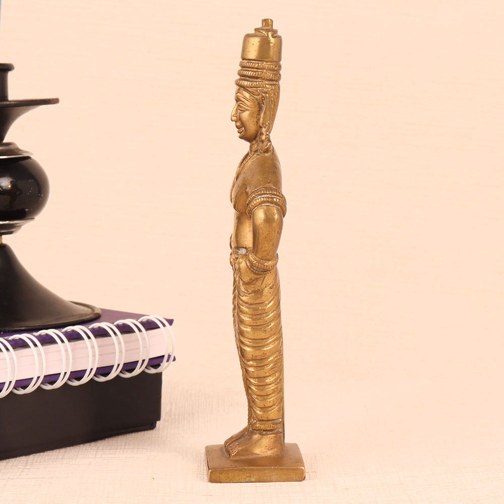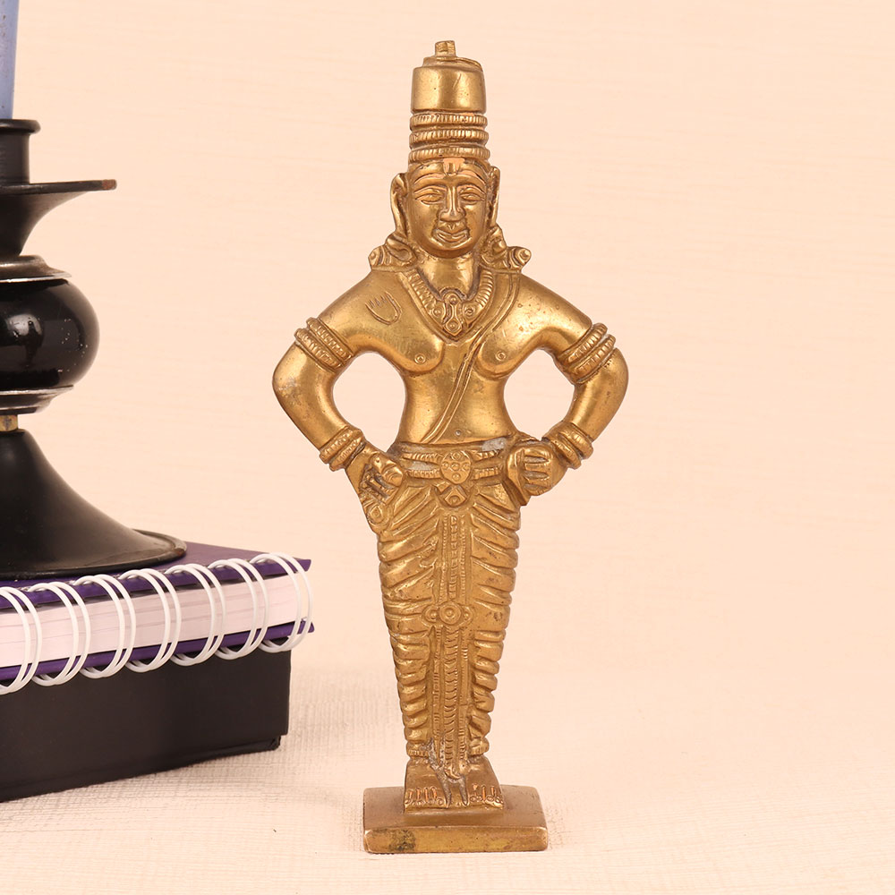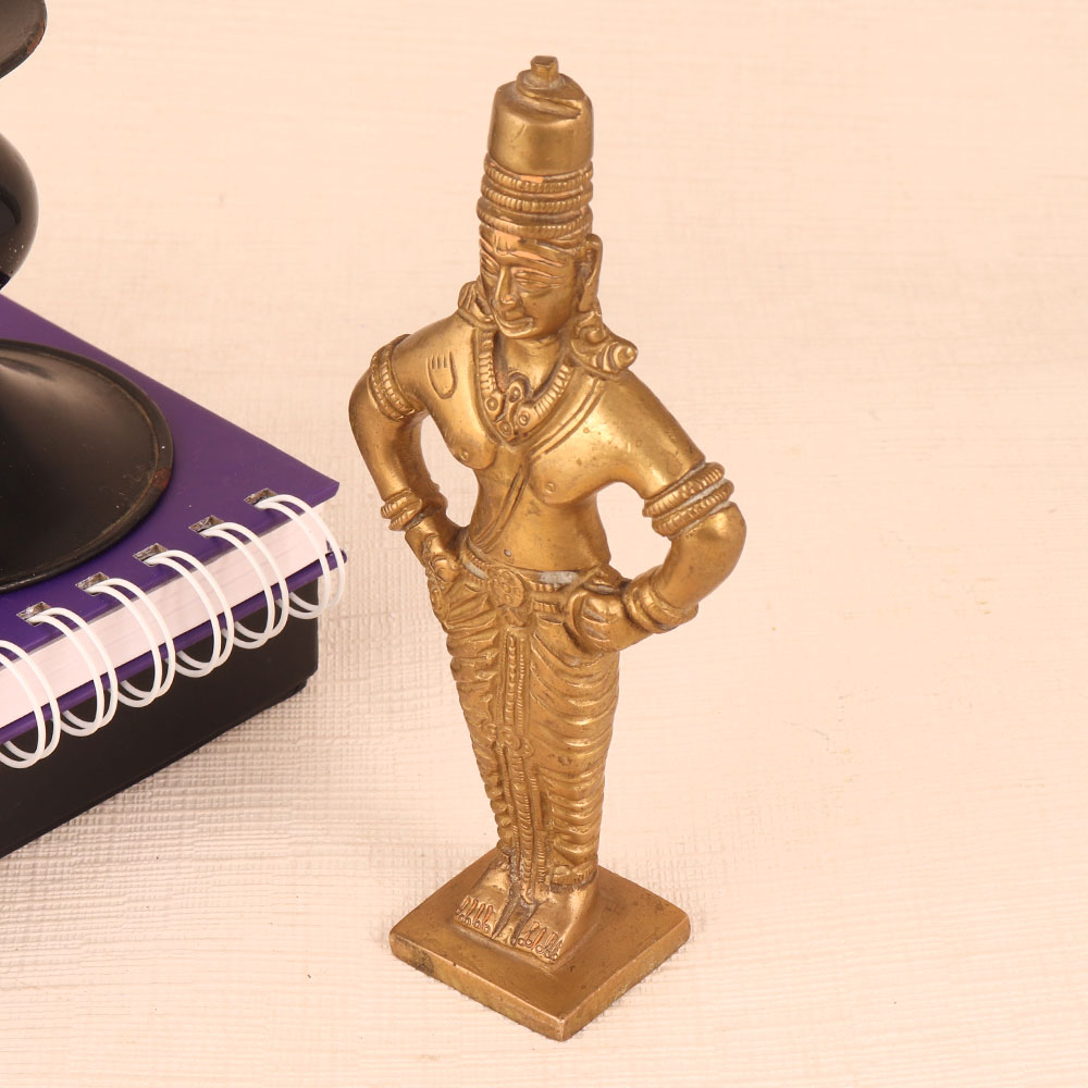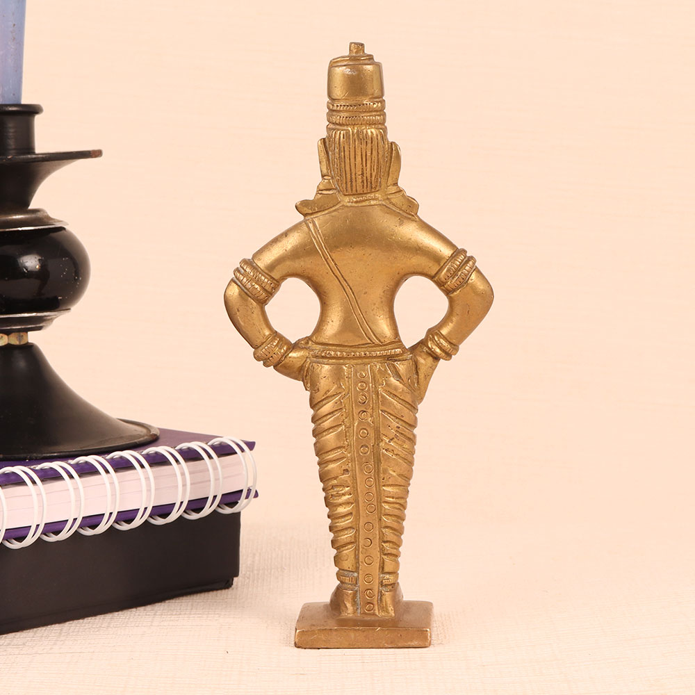 This Brass Statue of Lord Vitthal is a magnificent work of art that seamlessly blends spirituality, craftsmanship, and elegance. Standing majestically on a meticulously crafted platform, this exquisite piece boasts an antique golden finish that exudes timeless charm. Lord Vitthal, a revered deity in Hinduism is a manifestation of Lord Krishna and is often depicted in a distinctive manner, adorned with ornaments and a distinctive headdress. This handmade masterpiece is a testament to the devotion and skill of Indian artisans who have poured their expertise into creating a lifelike representation of Lord Vitthal. Crafted from high-quality brass, it radiates a lustrous glow, accentuating the divinity it symbolizes. This divine masterpiece is versatile in its use. It can grace the sanctity of your home's prayer room, add a touch of spirituality to your office, enhance the ambiance of your restaurant, hotel, cafe, or shop, or become a prized addition to any collector's vintage collection. Moreover, it makes for an exceptional and heartfelt gift for your loved ones on special, festive, or auspicious occasions, carrying with it the blessings of Lord Vitthal himself.