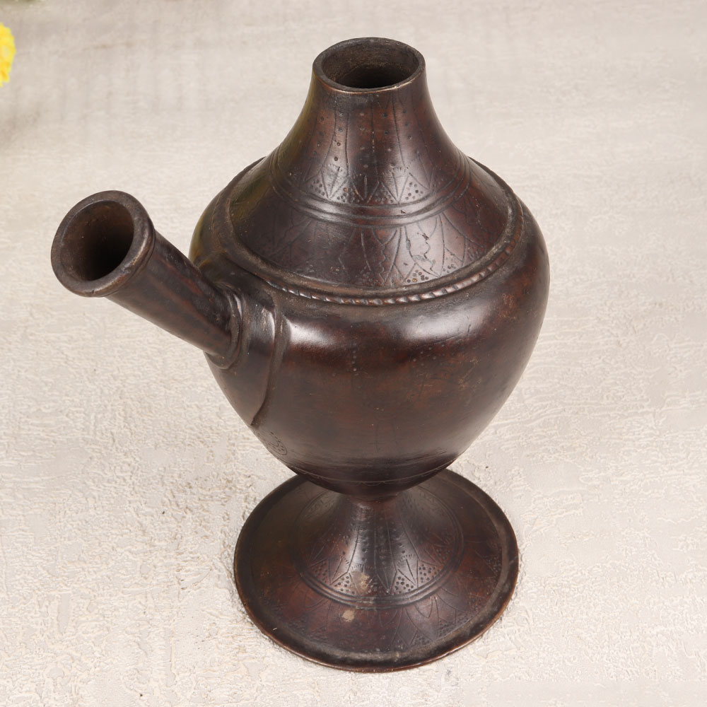 Immerse yourself in the rich cultural heritage of Himalayan Art with this exquisite vintage brass hookah base. Handcrafted by highly skilled and experienced Indian artisans, this piece is a testament to the meticulous craftsmanship passed down through generations. The antique dark brown finish adds a touch of nostalgia, creating a stunning visual appeal. The base is adorned with intricate engravings, showcasing the artistry and attention to detail that went into its creation. Crafted from high-quality brass, it exudes a timeless charm that seamlessly blends traditional elegance with contemporary aesthetics. This versatile piece can be displayed in various settings, including homes, offices, restaurants, hotels, or cafes. Transform it into a unique indoor flower pot, infusing your space with both history and natural beauty. This vintage brass hookah base is not merely a decorative item; it's a conversation starter and a valuable addition to any vintage collection. Consider it as a thoughtful gift for your loved ones on special, festive, or auspicious occasions, sharing the beauty of Himalayan craftsmanship with those close to your heart.