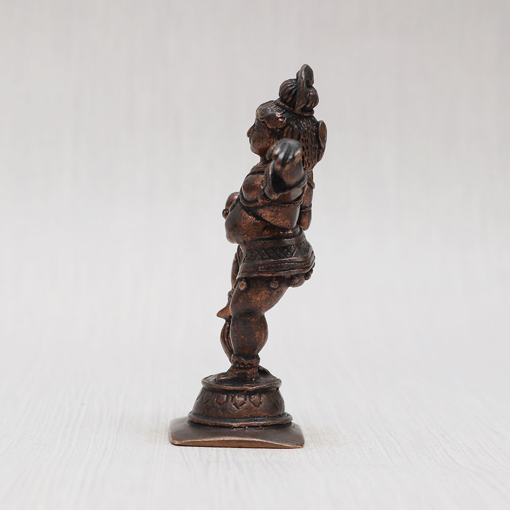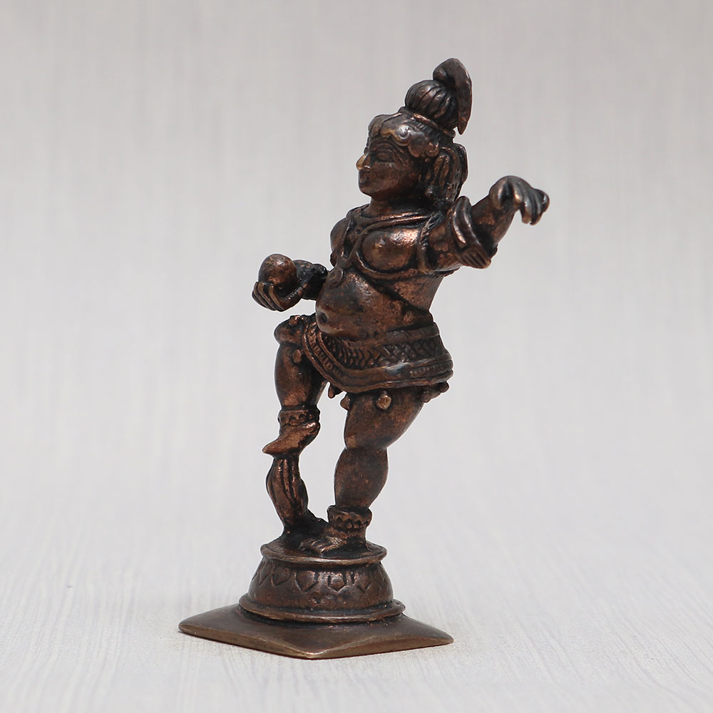 Buy a Copper Baby Lord Krishna standing statue online that is meticulously handcrafted by talented Indian artisans from the finest quality copper. With its vintage-style finish, this divine artwork is an ideal addition to your prayer room at home, office, restaurant, cafe, or shop. The idol boasts captivating detailing, making it a perfect item for exhibition, decoration, and collection. Its sacred aura and spiritual charm also make it a revered choice for temple worship. This Copper Krishna Statue stands as a testament to the artisan’s craftsmanship, creating a mesmerizing piece that radiates divinity and grace. It serves as a thoughtful gift for your loved ones on special, festive, or auspicious occasions, representing blessings and good fortune.