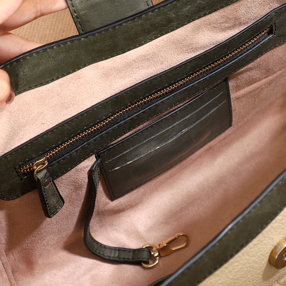 The zipper pocket on the back panel offers additional convenience for items you need to grab quickly. To top it off, the base feet in the shape of the logo adds a distinctive touch, elevating the totes overall look and keeping it upright and protected.