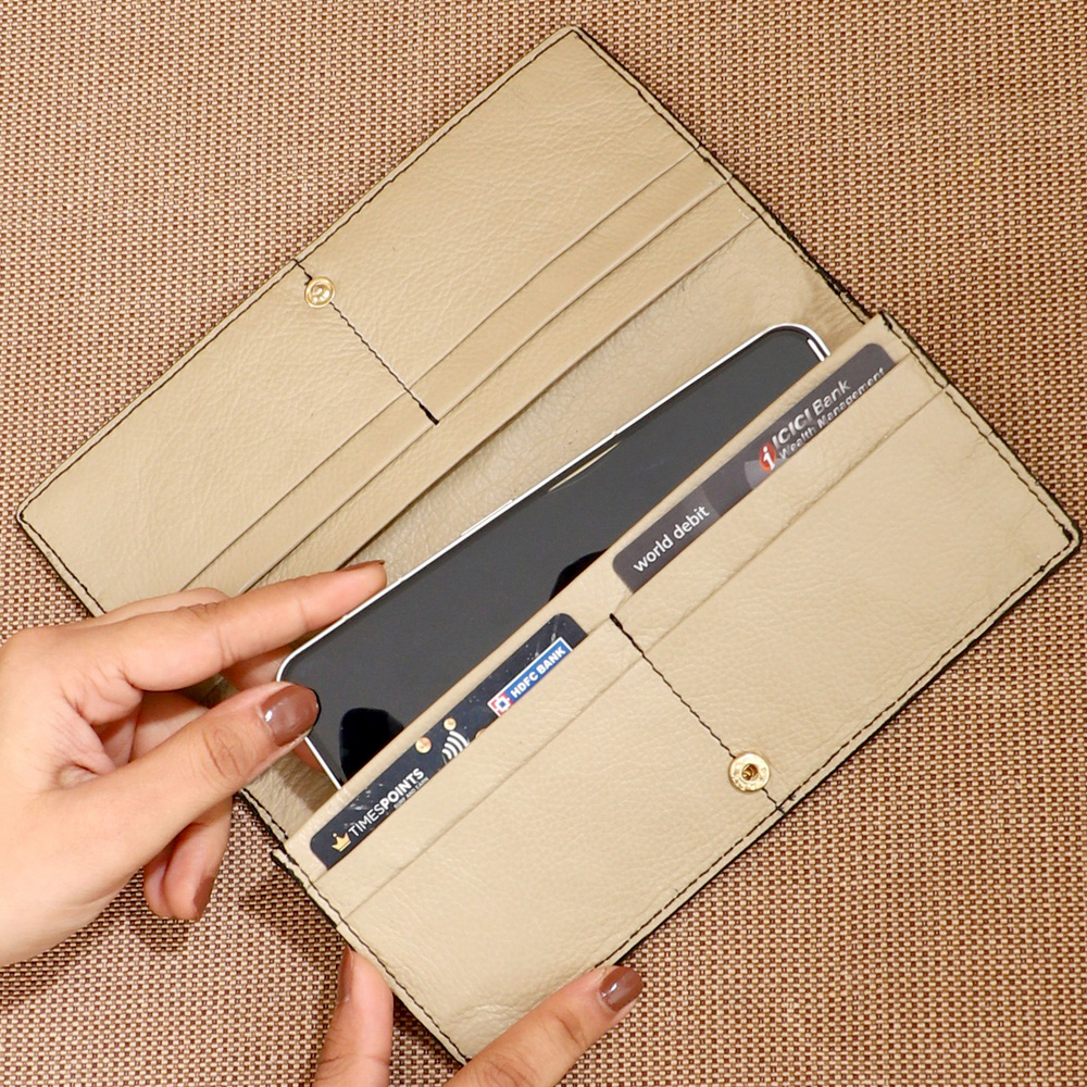 Crafted from amazing Honey Dew leather, it features a snap button closure for secure storage, this sleek wallet features 10 card slots for all your essentials, a currency slot to keep cash neatly tucked away, and even a mobile pocket for added convenience.
