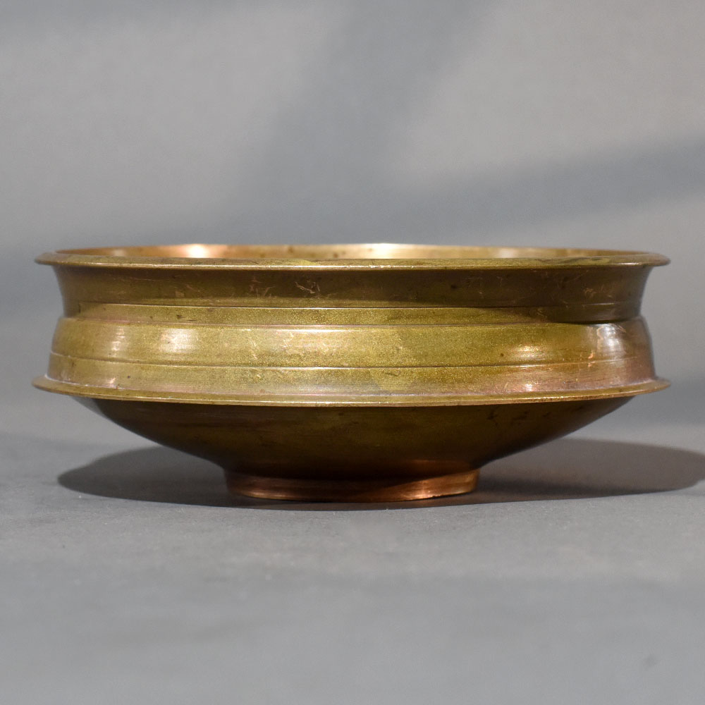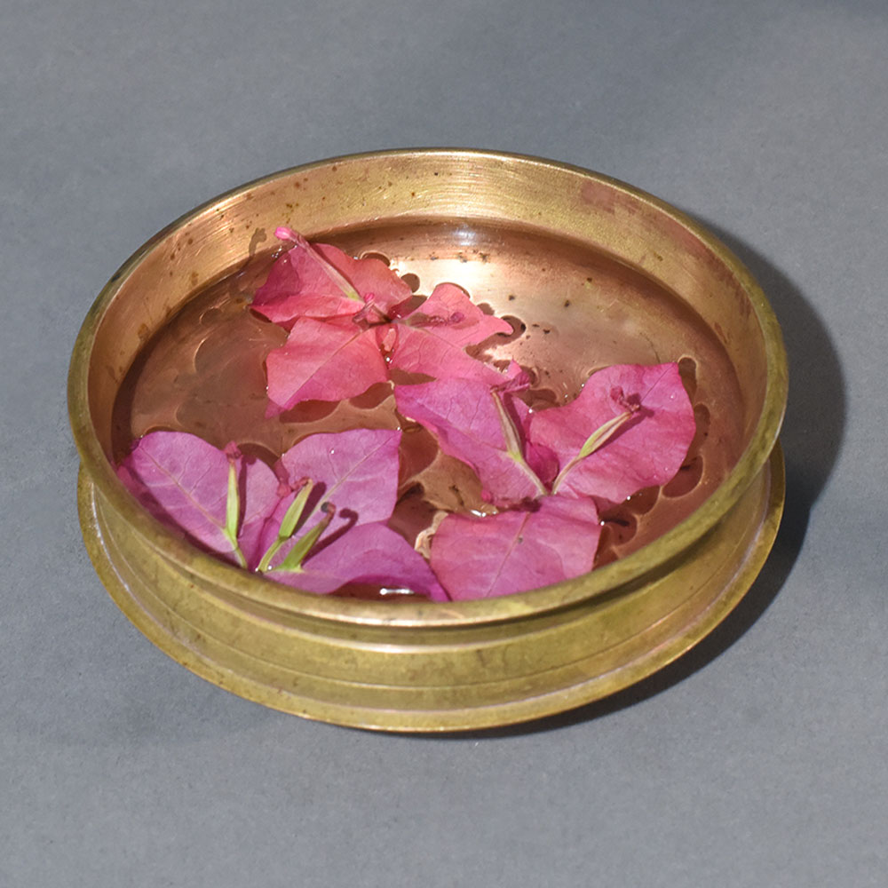 This vintage brass Urli pot represents the understated elegance of Himalayan metalware, where form follows ritual and beauty emerges through use. Traditionally used for floating flowers and ceremonial water displays, the Urlis shallow, wide-bodied design allows blossoms to rest naturally, creating peaceful and symmetrical arrangements. The brass has aged gracefully, developing a soft, warm patina that reflects its history. Small imperfections, tonal shifts, and surface marks add depth and authenticity, ensuring no two pieces look alike. Ideal for floral decoration during festive occasions or as a daily decorative accent, this Urli complements both classic and modern interiors. It can be placed in entryways to welcome guests, in pooja rooms for ritual offerings, or as a centerpiece filled with floating candles and petals. Even when left empty, the sculptural silhouette makes it a striking decor element. This Urli is not merely a decorative bowl but a functional art object that carries cultural memory, making it a meaningful addition to any thoughtfully curated space.