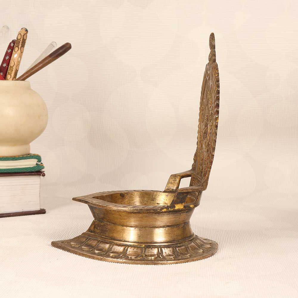 Illuminate your home with the divine light of the goddess Gajlaxmi with this vintage brass oil lamp. This intricately carved lamp depicts the Hindu goddess Gajlaxmi, who brings good fortune, wealth and prosperity into homes. The lamp features fine details of Gajlaxmi, elephants and traditional Indian motifs that will add an elegant, spiritual touch to any room. This special lamp makes a wonderful housewarming or wedding gift. The soft glow of the flame is calming and peaceful, creating an ambiance perfect for meditation, prayer, or just relaxing at the end of a long day. Give the gift of serenity and invite fortune into your home with this divine brass Gajlaxmi lamp.
