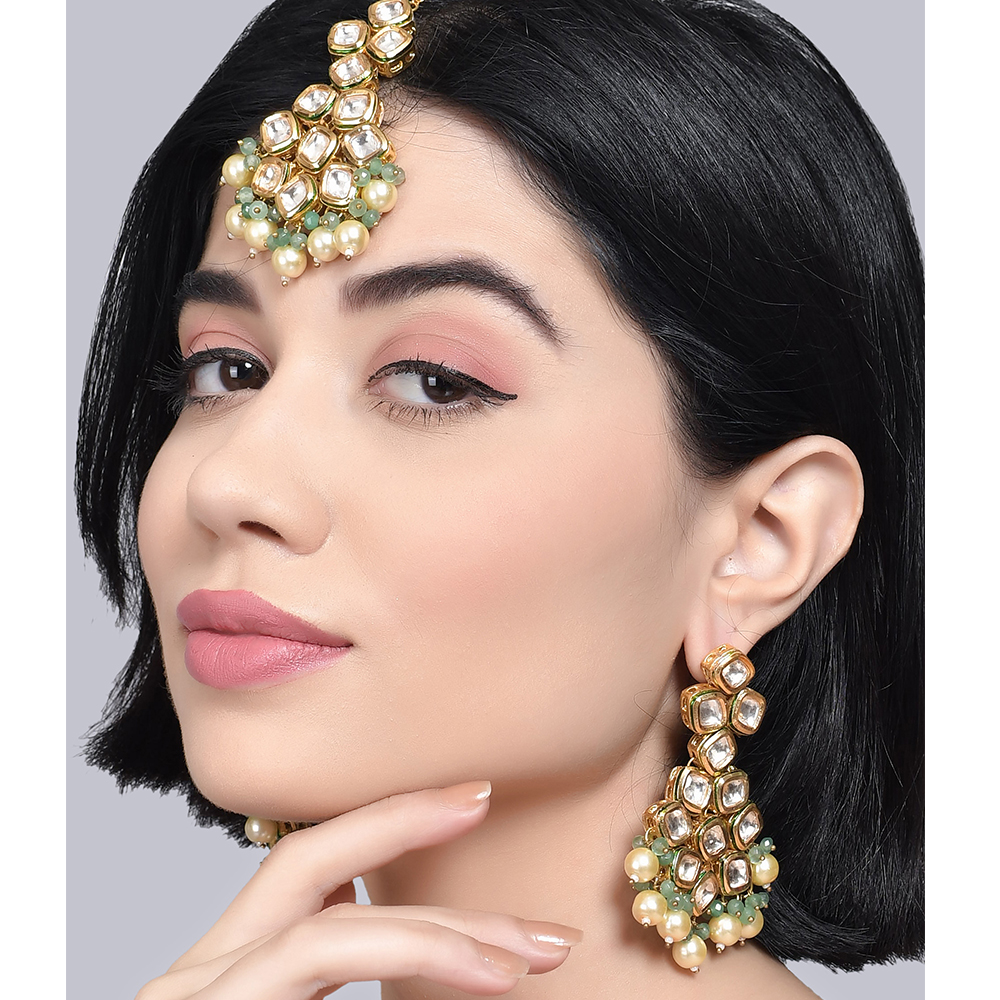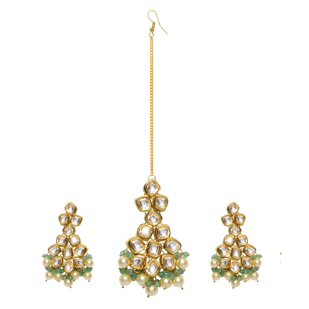 The Handcrafted Ivory Pearl and Mint Stone Chandelier Earring Set with Maang Tikka is a refined expression of pastel-toned ceremonial jewelry. Designed in polished golden brass, this coordinated set features cascading chandelier earrings adorned with ivory pearl accents and soft mint stones. The matching maang tikka completes the look with balanced symmetry and gentle radiance. At 3.5 inches in length, the design offers graceful movement while maintaining comfortable wear for extended celebrations.