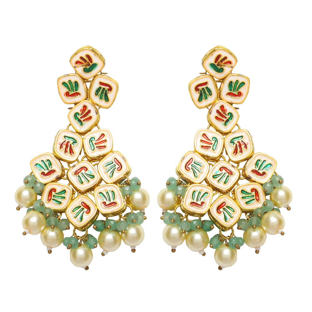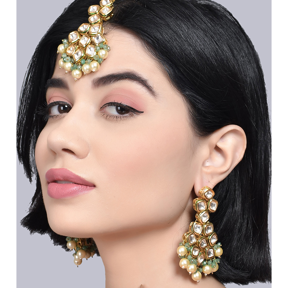 Handcrafted Ivory Pearl and Mint Stone Chandelier Earring Set with Maang Tikka