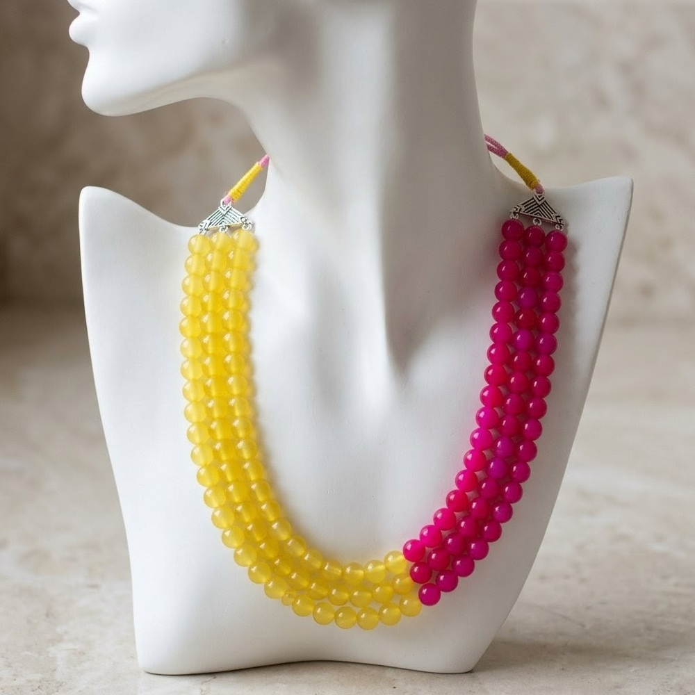 This handcrafted handmade jewelry glass stone dual tone necklace is a striking blend of bold color and artisan craftsmanship. Designed with vibrant yellow and pink glass stones, this piece creates a powerful visual contrast that instantly elevates your style.