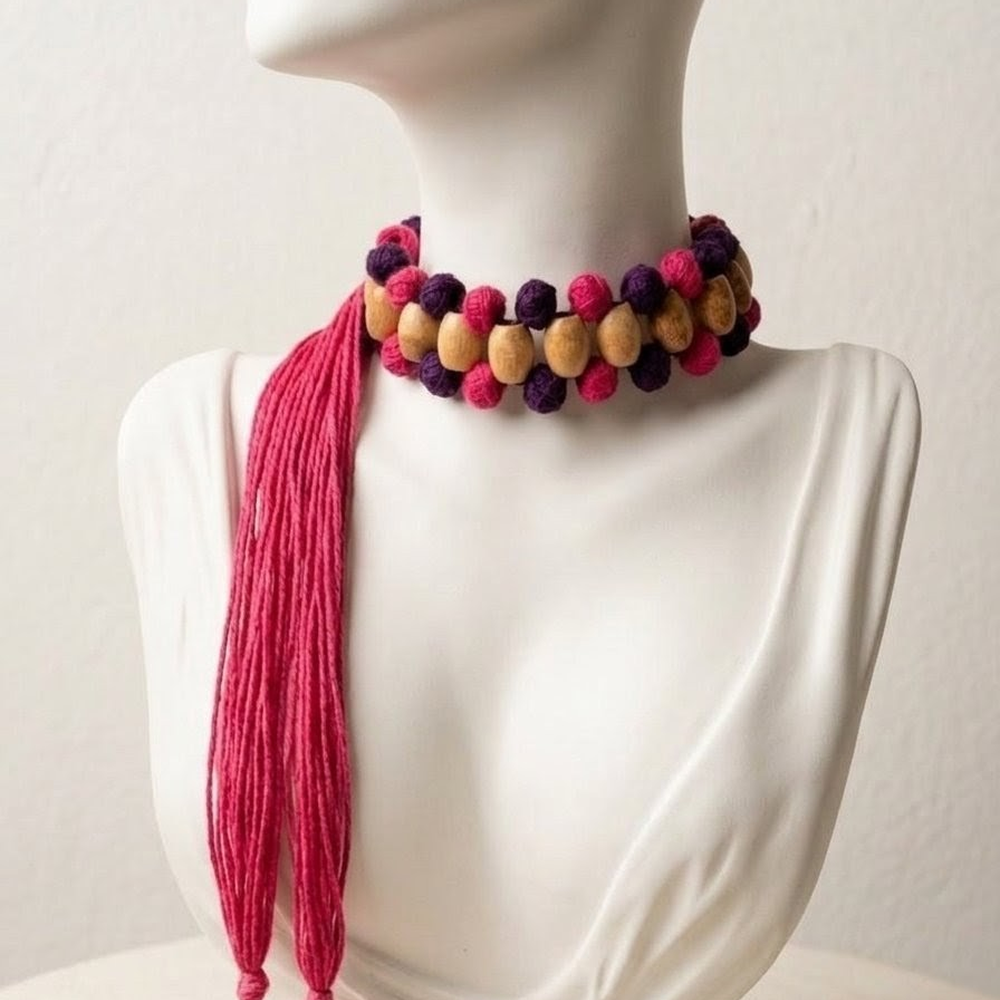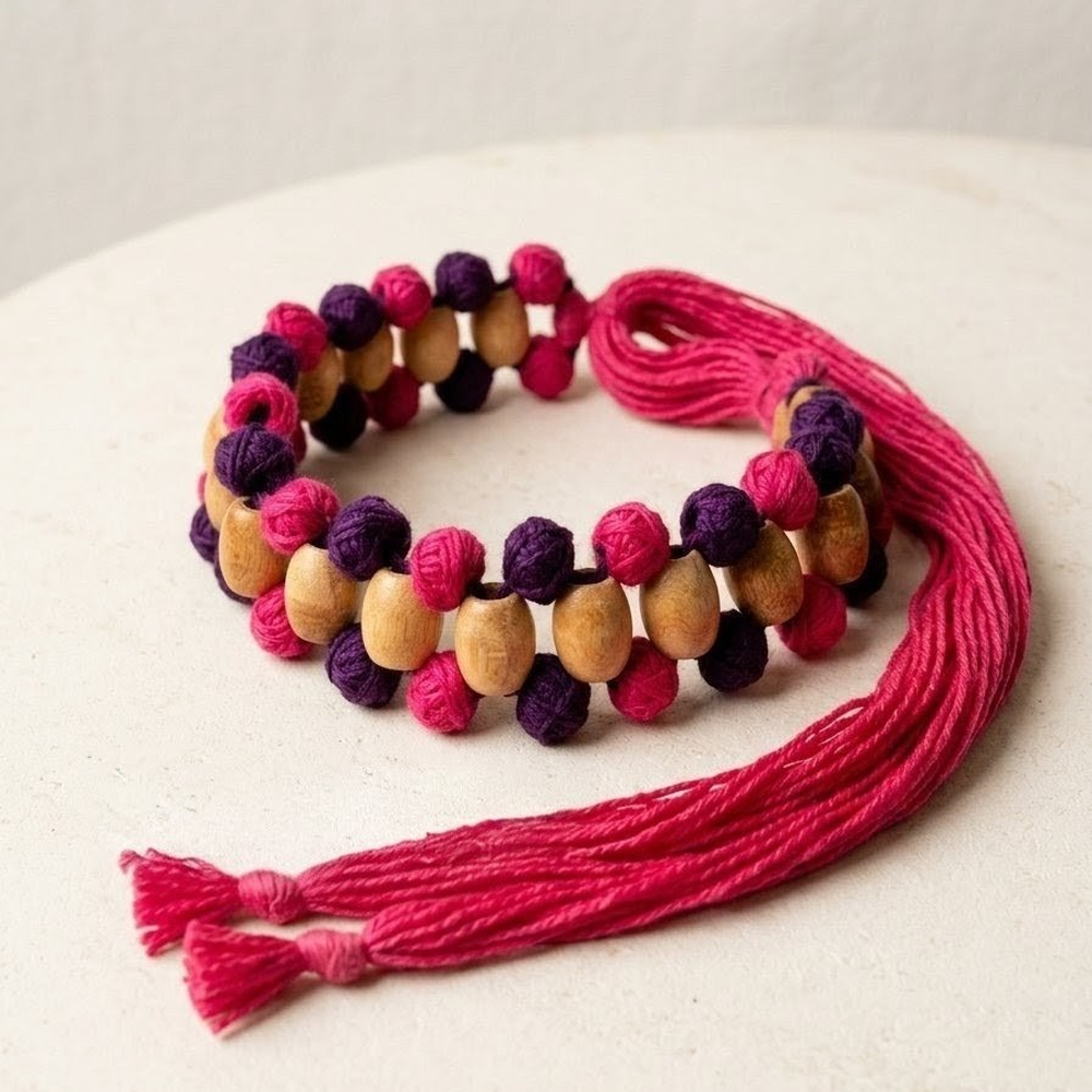 This handcrafted handmade jewelry wooden bead choker necklace combines bold color with artisanal craftsmanship. Featuring a vibrant mix of pink and purple thread beads paired with natural wooden beads, this choker creates a striking and contemporary statement.
