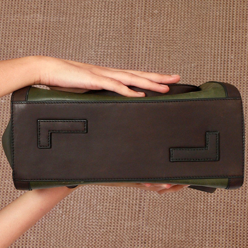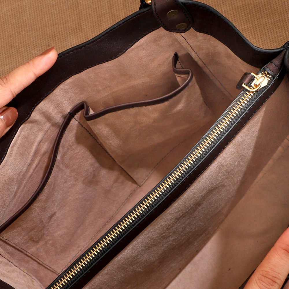 The zipper pocket on the back panel offers additional convenience for items you need to grab quickly. To top it off, the base feet in the shape of the logo adds a distinctive touch, elevating the totes overall look and keeping it upright and protected.