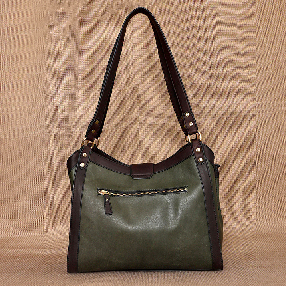 Crafted in gorgeous Jungle and Dark Chocolate Leather, this tote is secured with a sleek magnetic loop closure and comfortably fits laptops up to 13 inches. Beyond the laptop compartment, it offers ample space for your diary, notebook, documents, and other office essentials, ensuring to be your ideal daily companion.