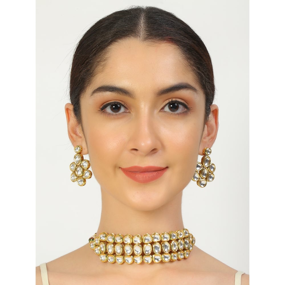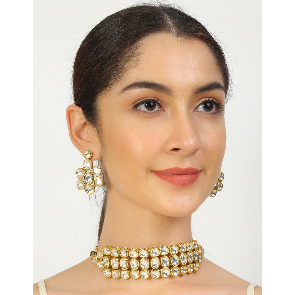 This handcrafted choker features a structured kundan grid pattern that delivers visual balance, comfort, and lasting elegance for both ceremonial and statement wear.
