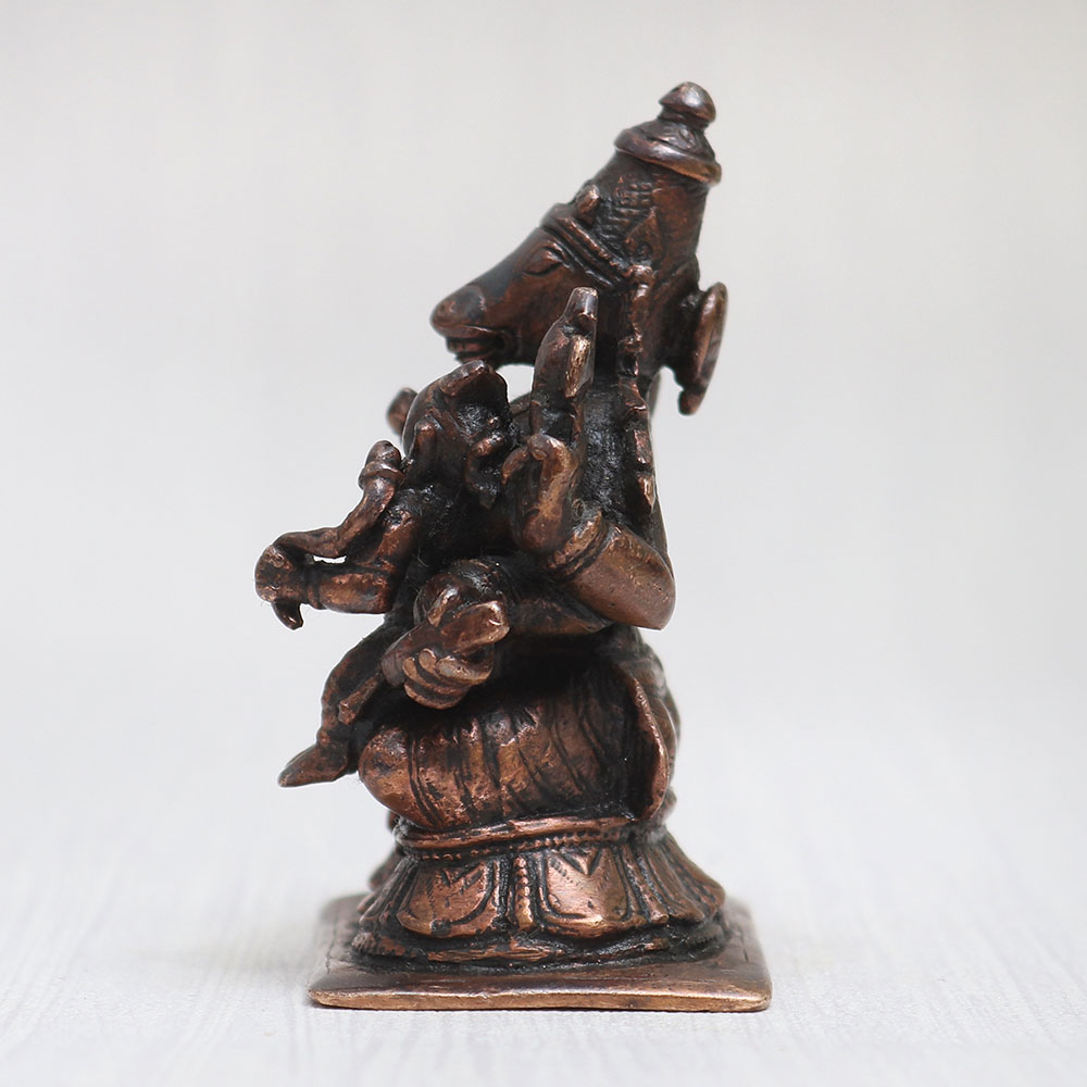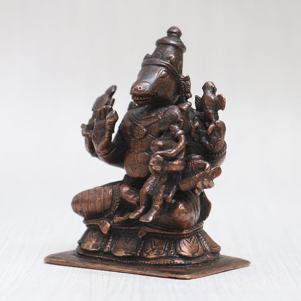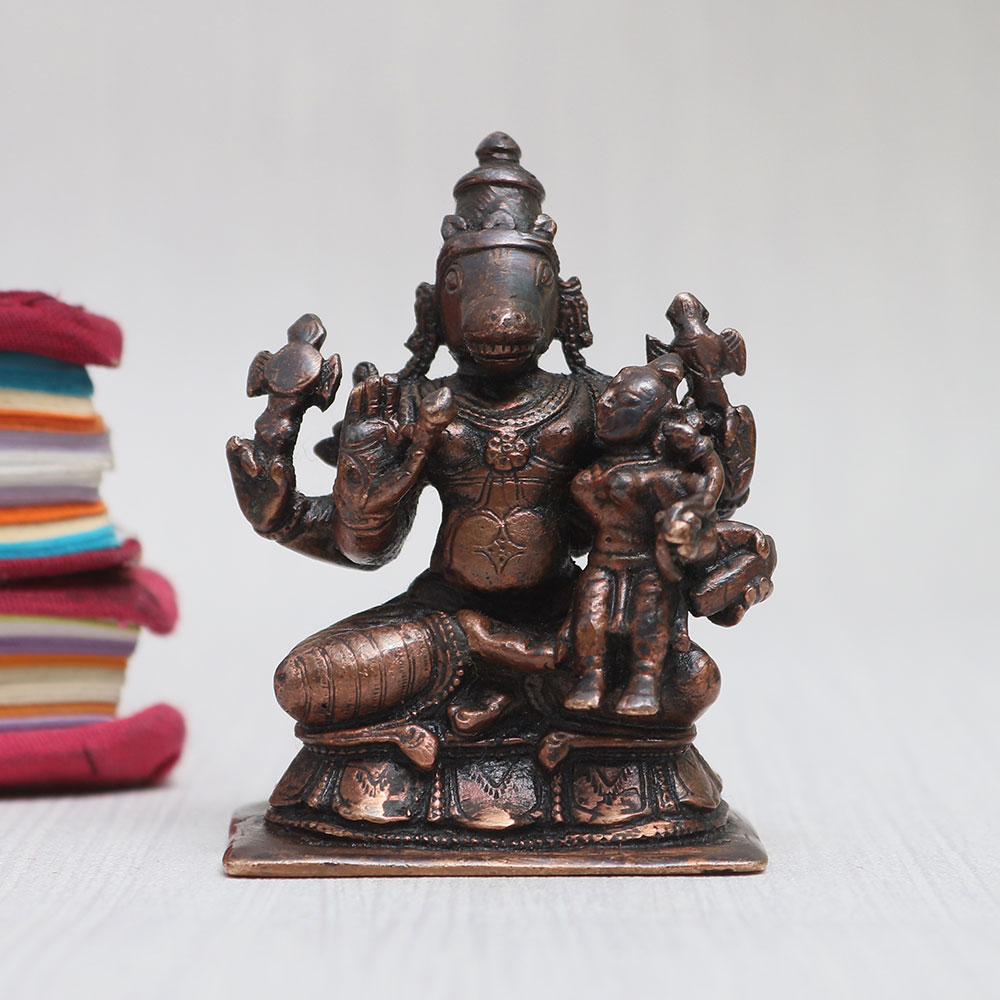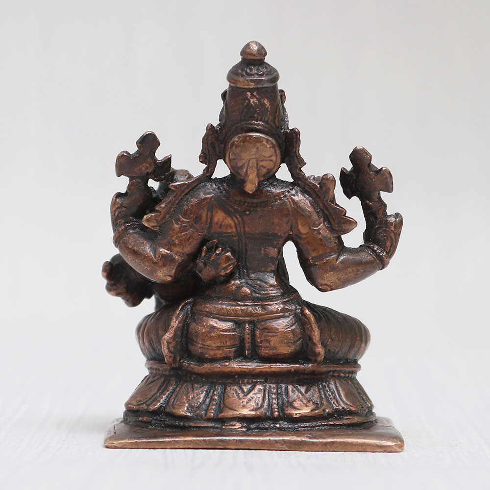 Buy a Hindu Goddess Maa Lakshmi Copper Statue online featuring the revered deity Lord Hayagriva and Goddess Lakshmi seated together in an enchanting composition. Handcrafted with meticulous attention to detail by highly talented Indian artisans, this vintage masterpiece is fashioned from high-quality copper, radiating an alluring aura of elegance and spirituality. This awe-inspiring murti depicts Lord Hayagriva, an avatar of Lord Vishnu, seated in a regal posture with the Goddess Lakshmi nestled on his left lap. The statue's intricate craftsmanship captures the divine expressions and intricate adornments, evoking a sense of reverence and beauty. Perfect for adorning your home, office, restaurant, hotel, or cafe temple, this extraordinary piece can also be utilized for collection, exhibition, or as a captivating decorative centerpiece. Furthermore, it serves as an auspicious gift, representing divine blessings for your loved ones on special, festive, or auspicious occasions. Lord Hayagriva is a deity associated with wisdom, knowledge, and learning. His presence in your surroundings is said to create an atmosphere of spiritual serenity and enlightenment.
