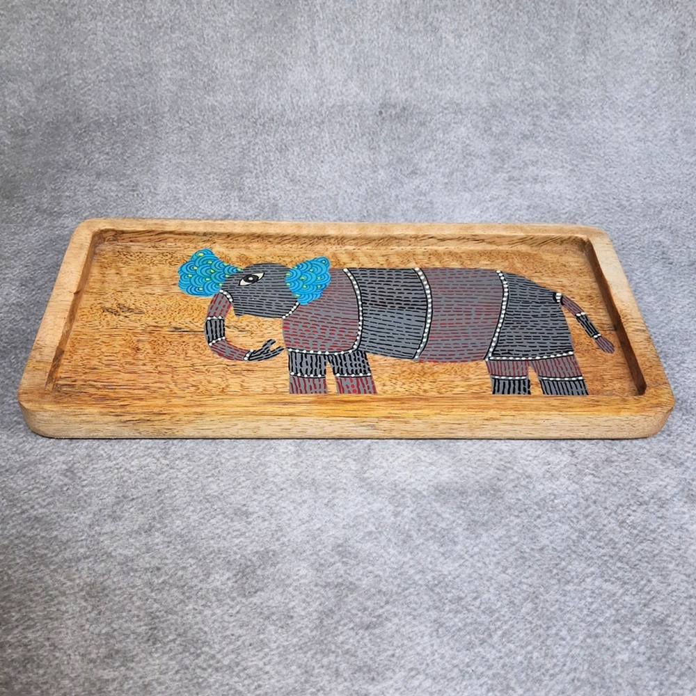 This handcrafted mango wood hand painted tray features a beautifully detailed elephant motif, combining traditional artistry with practical functionality. The natural wooden base paired with intricate hand painted design creates a unique serving tray that stands out in any setting.