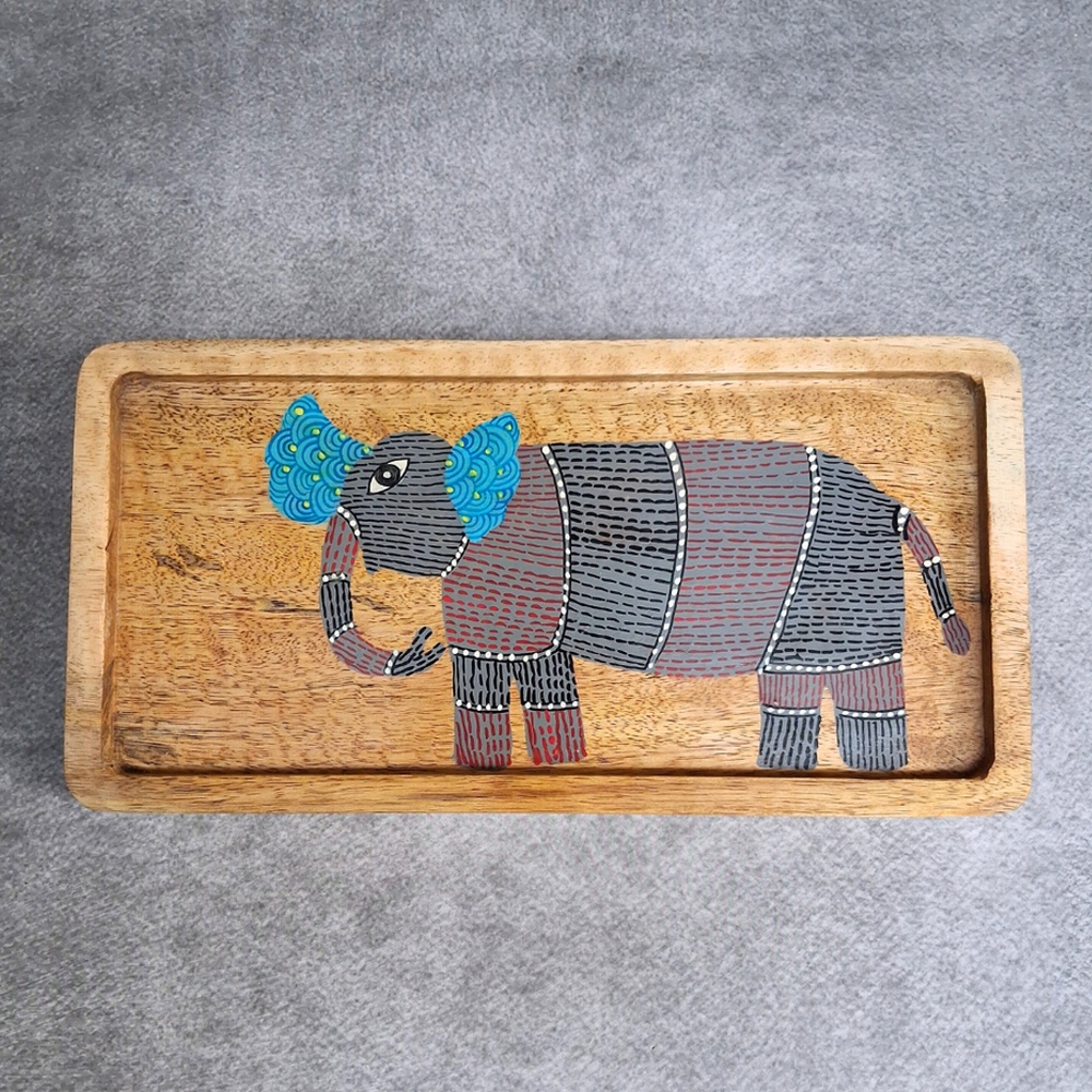 The artistic elephant motif adds a cultural and decorative element, making the tray visually striking and distinctive.