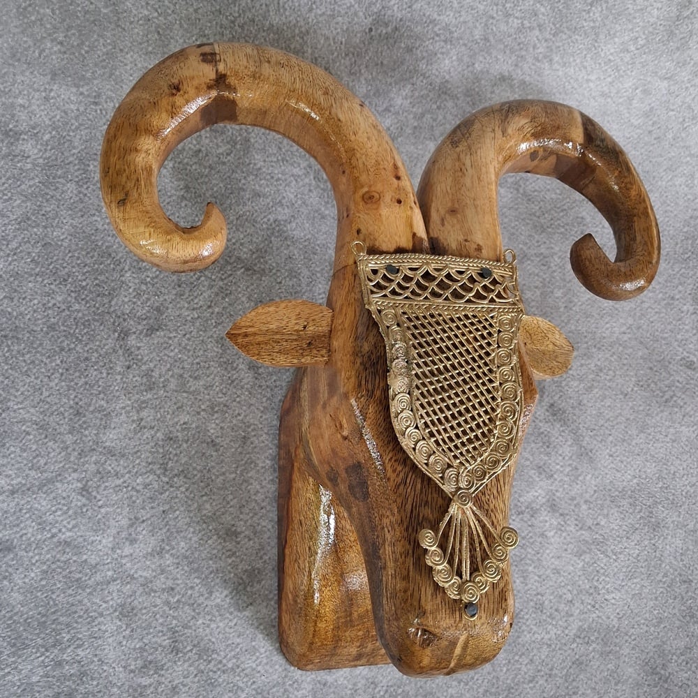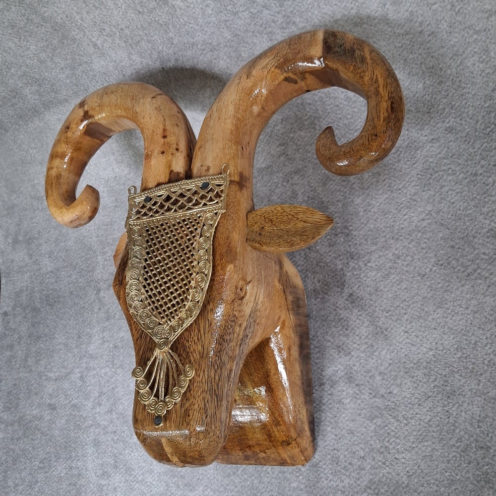 This handcrafted mango wood ram head wall decor combines bold artistic form with traditional craftsmanship. Featuring a finely carved ram head made from seasoned mango wood and accented with a handcrafted brass accessory, this piece creates a striking and sculptural statement for modern interiors.