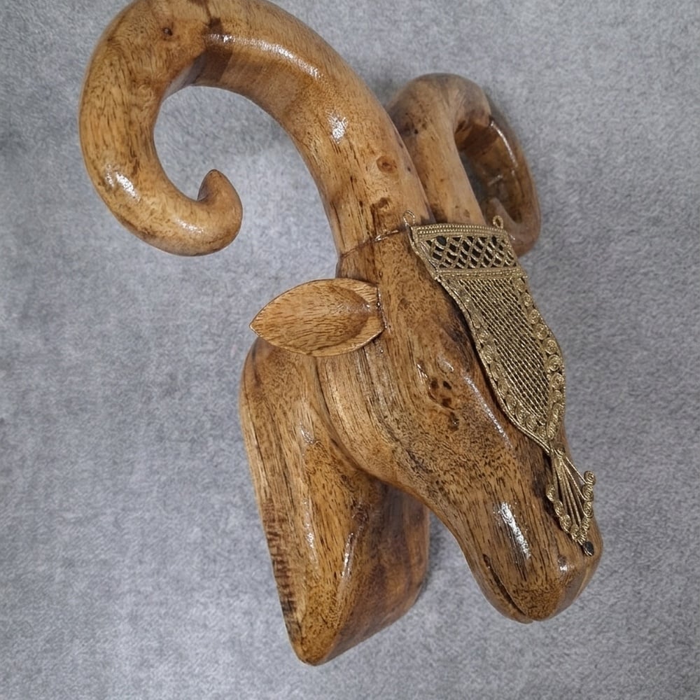 • Handcrafted Mango Wood Ram Head Wall Decor with Brass
