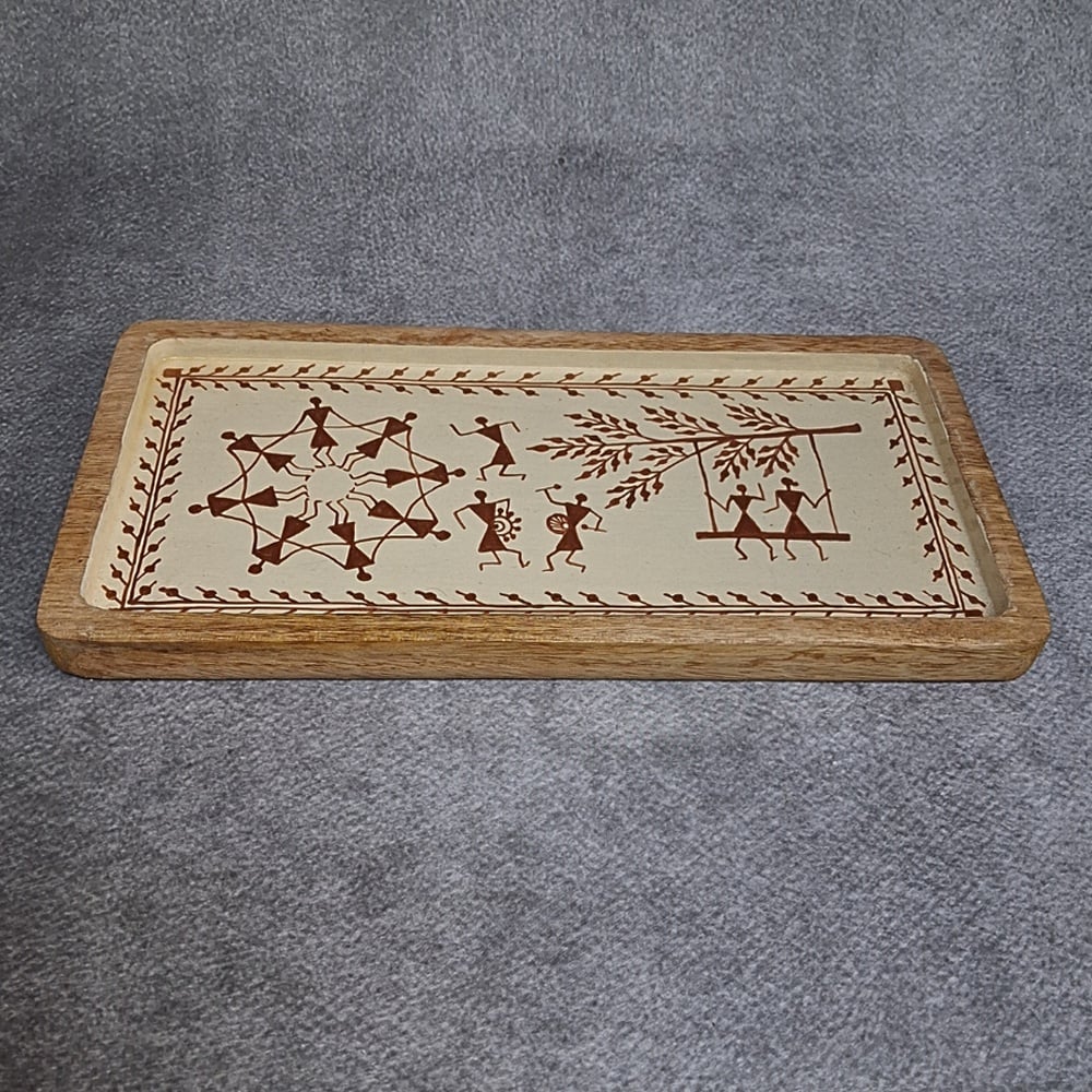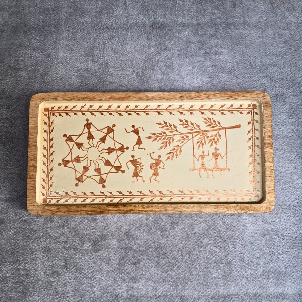 This handcrafted mango wood Warli hand painted tray showcases traditional tribal storytelling through detailed artwork and functional design. Featuring intricate Warli figures and geometric patterns on a natural wooden base, this tray adds cultural depth and elegance to your home.