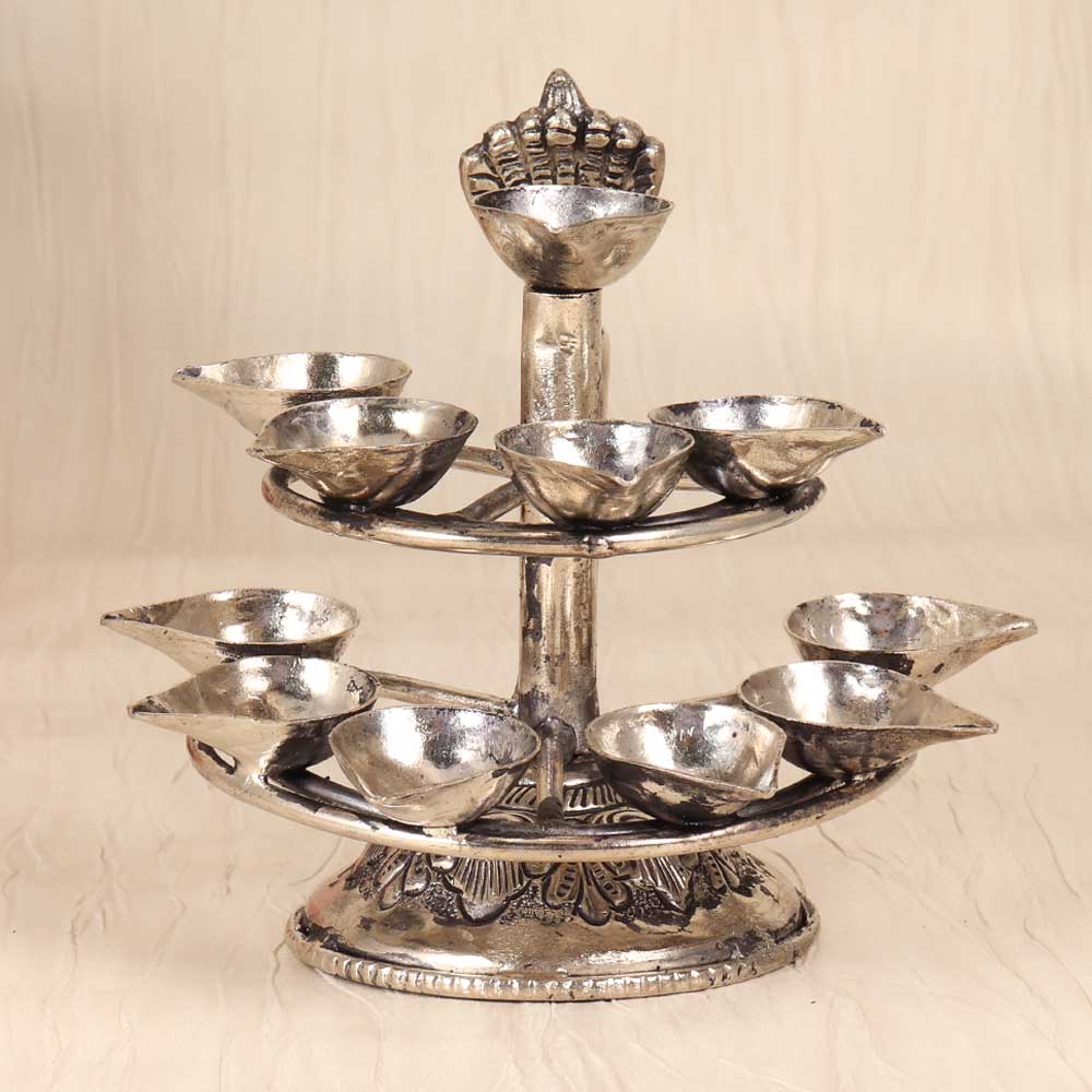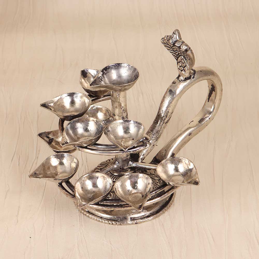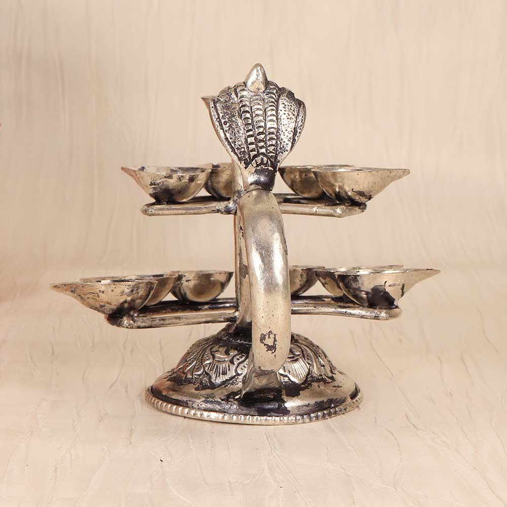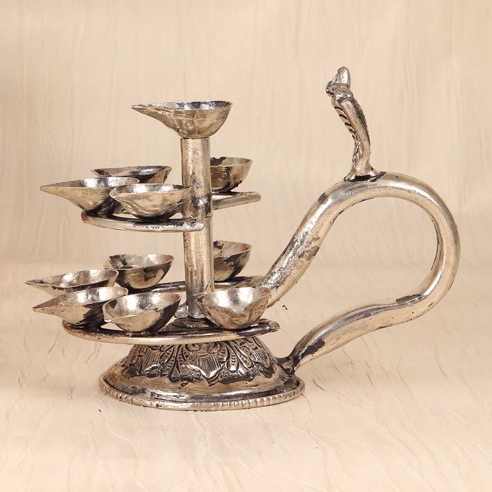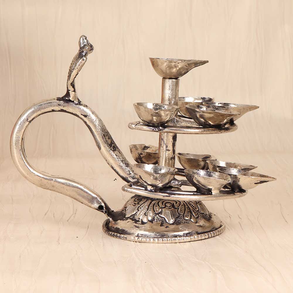 Light up your home in elegance with the vintage brass nickel plated aarti oil lamp. This stunning lamp brings a touch of tradition and spirituality to any space with its intricate cobra handle design and ability to light 11 jyots at once. This special lamp allows you to perform the traditional aarti ceremony in your own home, bringing peace and positive energy to your surroundings. Bringing together form and function, this lamp is perfect for anyone wanting to connect with their heritage and spirituality. The vintage styling gives a nod to tradition while the multiple wicks allow you to create a beautiful glow during your daily puja or special celebrations.
