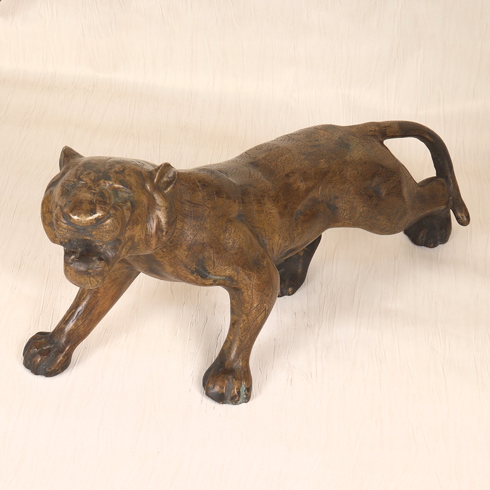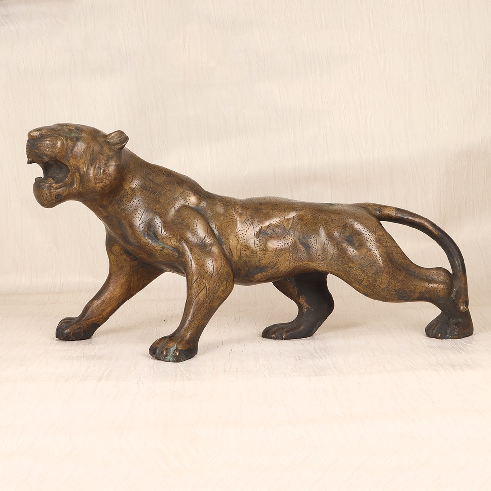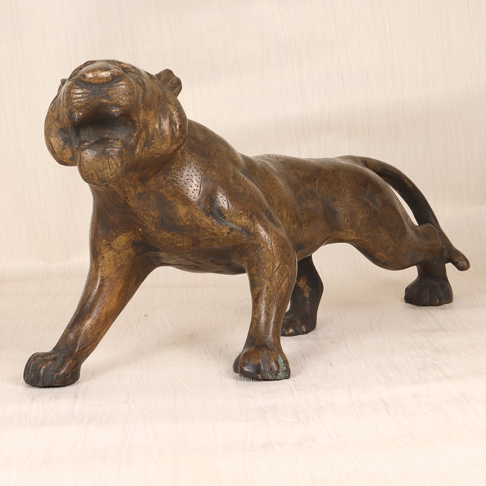 Roar with regal elegance in your home with this captivating pair of vintage brass tiger statues. Crafted with meticulous attention to detail, each statuette showcases the powerful, graceful spirit of these magnificent felines through intricate engraving and a stunning brass finish that commands attention. These brass tigers are more than just home accents - they're works of art that bring the wild spirit of the jungle into your living room. Display them prominently on a mantel, bookshelf or entryway table to instantly elevate your space with an aura of regal, untamed beauty. As conversation-starting focal points, these statues will have your guests in awe of their stunning craftsmanship and commanding presence. Whether you're a lover of exotic wildlife, an admirer of fine metalwork, or simply seeking to infuse your home with a sense of adventurous, primal energy, this vintage brass tiger statue pair is an investment that will elevate your decor for years to come. Unleash the majesty of the wild and make these majestic felines the heart of your space.