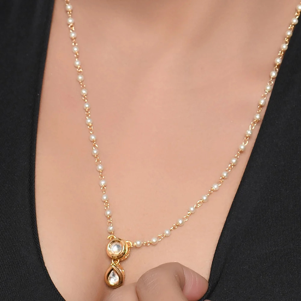 The Handcrafted Pearl Drop Mirror Pendant Necklace with Delicate Bead Chain combines refined detailing with timeless ethnic charm. Crafted in polished golden brass, the necklace features a radiant mirror stone pendant accented with a graceful pearl drop. The delicate bead chain enhances the overall design with subtle texture and elegance. With its balanced 20-inch length, this handcrafted piece sits beautifully along the neckline, making it perfect for festive and everyday styling.