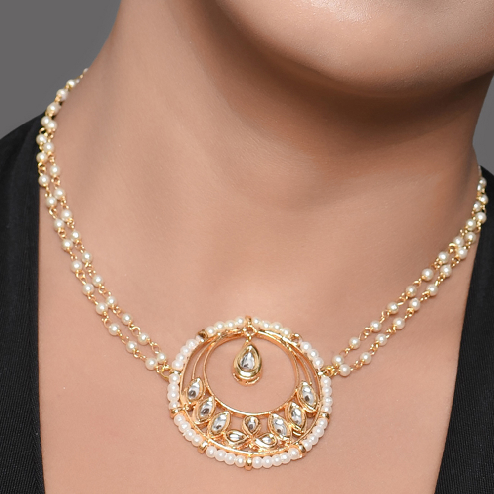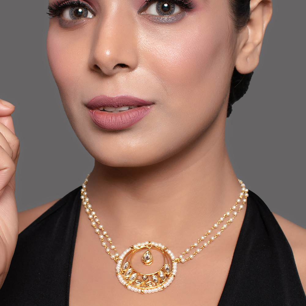 Softly elegant and delicately balanced, this handcrafted pearl halo necklace set highlights refined craftsmanship with a contemporary ethnic touch. The necklace features a circular openwork pendant accented with mirror-style stones, suspended on dual strands of fine pearls for a graceful silhouette.