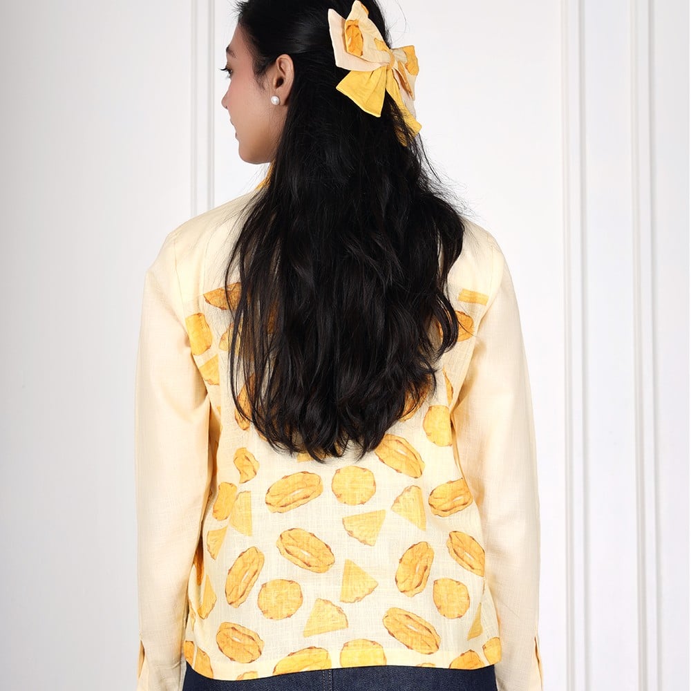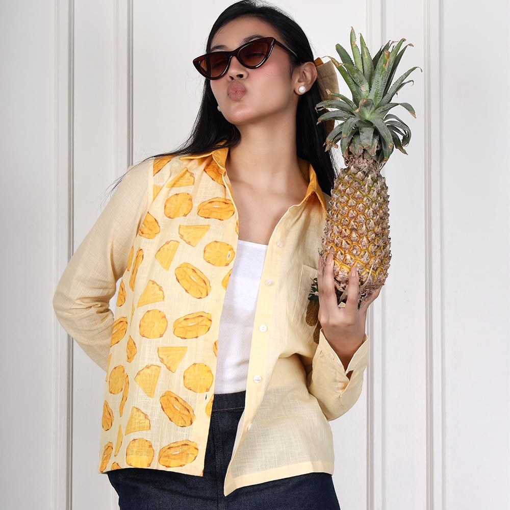 This handcrafted pineapple print cotton shirt is designed to bring a fresh and playful tropical vibe to everyday fashion. Featuring a soft pastel yellow base with hand-illustrated pineapple slice prints and subtle embroidered motifs, it offers a balanced mix of fun and minimal style.