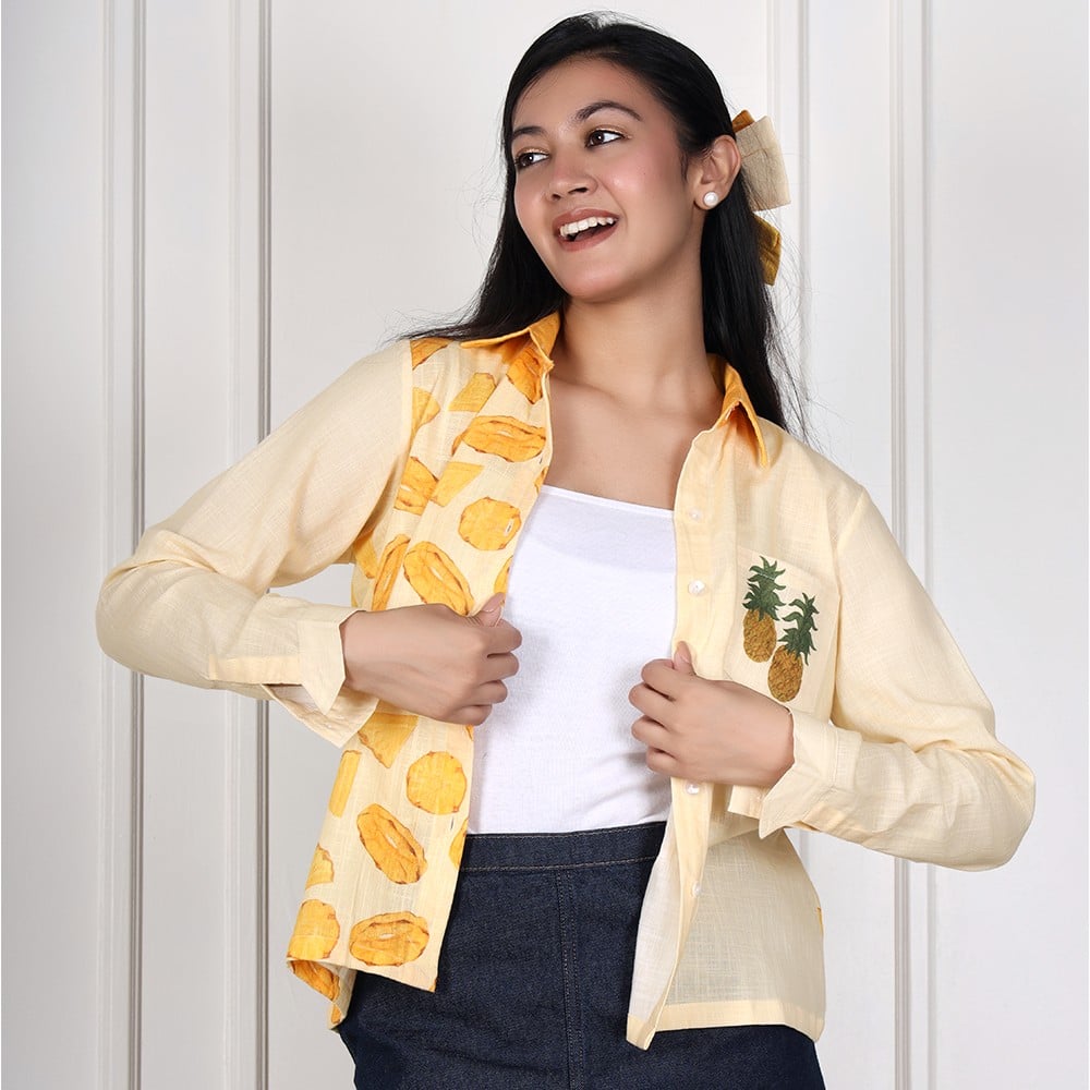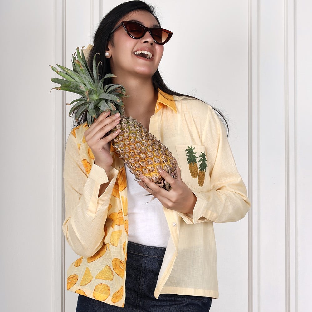 This handcrafted pineapple print cotton shirt is designed to bring a fresh and playful tropical vibe to everyday fashion. Featuring a soft pastel yellow base with hand-illustrated pineapple slice prints and subtle embroidered motifs, it offers a balanced mix of fun and minimal style.