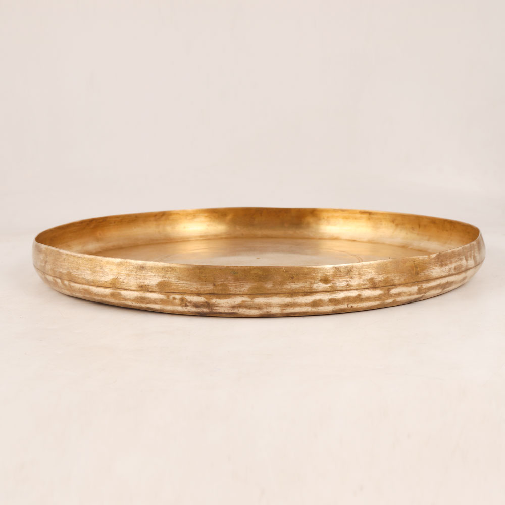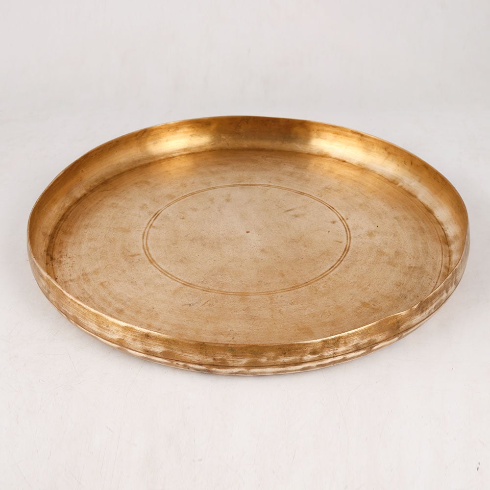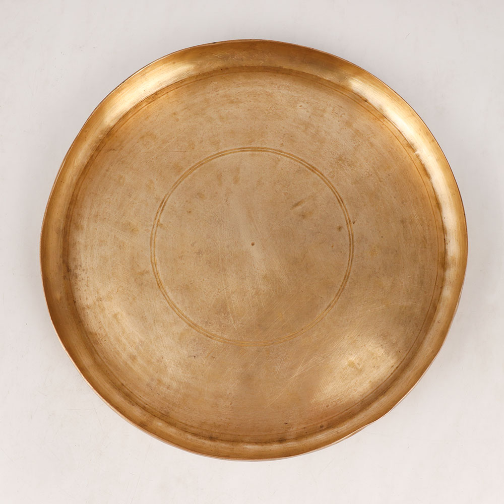 Experience the timeless allure of our exquisite Bell Metal Plate or Thali, a true embodiment of artistry and craftsmanship. Handcrafted by talented Indian artisans hailing from the enchanting land of Himachal Pradesh, this plate resonates with history and tradition. Made from high-quality bell metal, its antique golden finish imparts an aura of vintage grandeur. Originally designed for serving food, this plate now stands as a symbol of heritage and charm. Its intricate detailing and graceful curvature evoke a sense of nostalgia, perfect for adorning your living space, office, restaurant, hotel, or cafe. While its culinary purpose has evolved, its beauty remains everlasting. Whether gracing an exhibition or nestled within a vintage collection, this bell metal plate narrates a story of cultural opulence. As a thoughtful gesture, it makes for an exceptional gift on special, festive, or auspicious occasions, allowing you to share the elegance of tradition with your loved ones.
