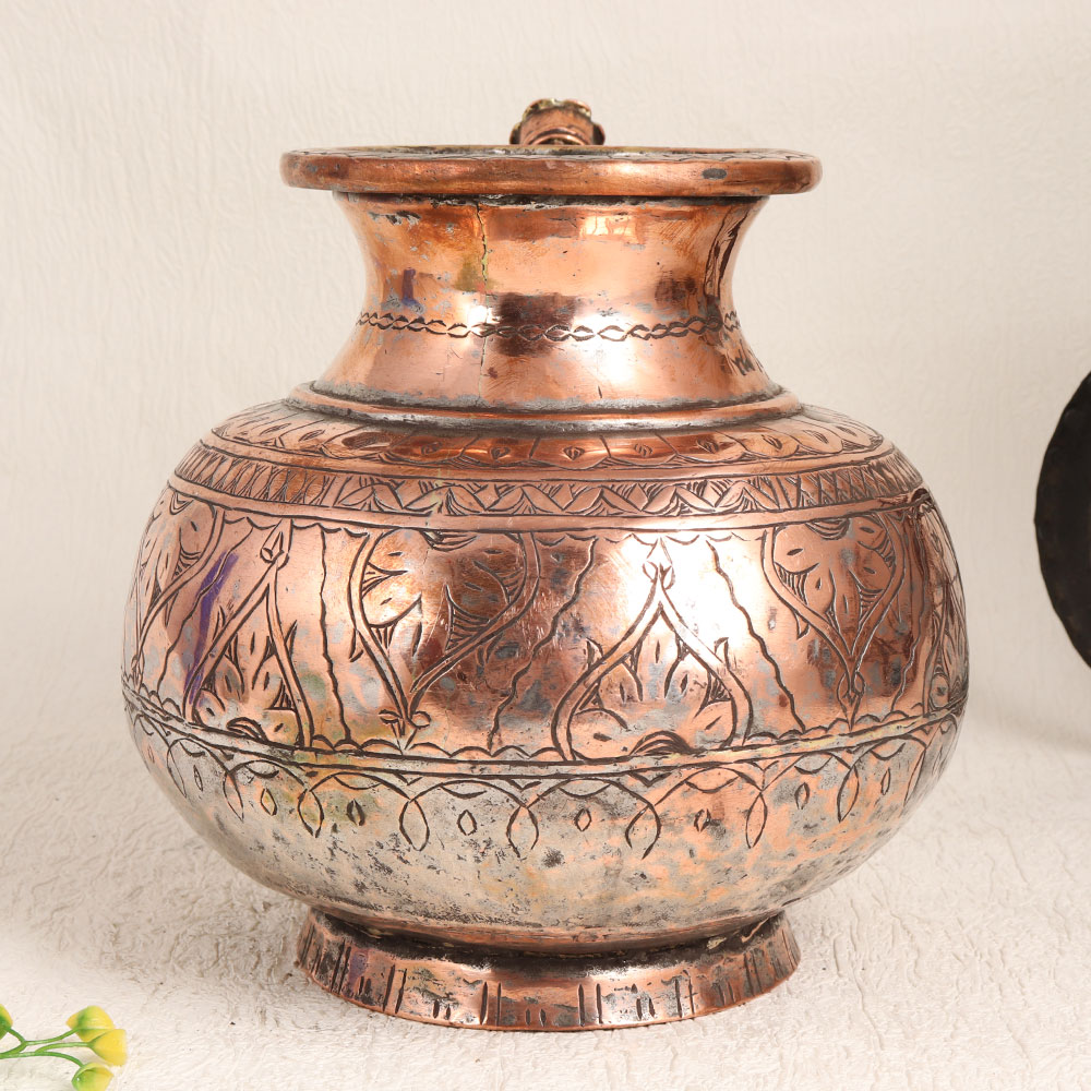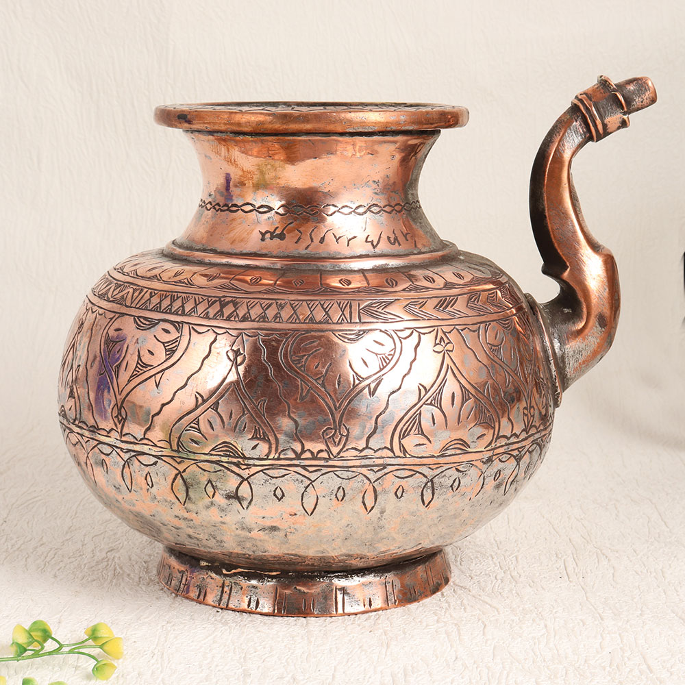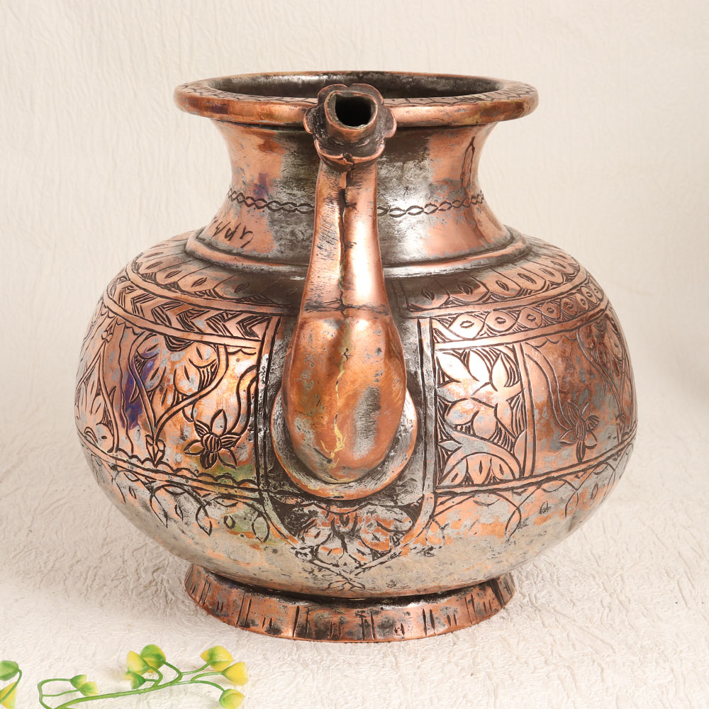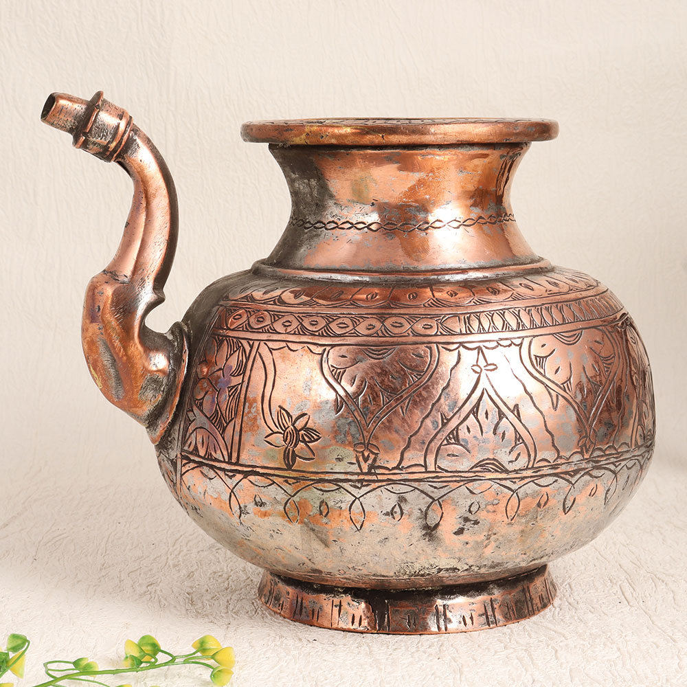 This Vintage Copper Holy Water Pot is a true masterpiece of Islamic Artistry. Handcrafted with meticulous attention to detail by talented artisans, this exquisite piece showcases the rich heritage of craftsmanship that dates back centuries. Made from high-quality copper, this pot boasts a warm antique brown finish that adds a touch of rustic charm to any setting. Its intricate engravings tell stories of faith and culture, making it a cherished piece for collectors and enthusiasts of vintage art. Versatile in its application, this holy water pot features a convenient spout, making it suitable for use in various settings, including your home, office, restaurant, hotel, cafe, or shop. Use it for decoration to infuse an air of sophistication or as a unique flower pot that blends tradition with nature. Furthermore, this pot is not just a decorative piece but also serves a sacred purpose during havan, prayer, or temple rituals. If you're a collector, this vintage copper pot is a must-add to your collection, and it can also be proudly displayed at exhibitions to share its historical significance. Consider gifting this remarkable piece to your loved ones on special, festive, or auspicious occasions.