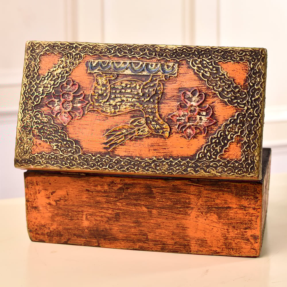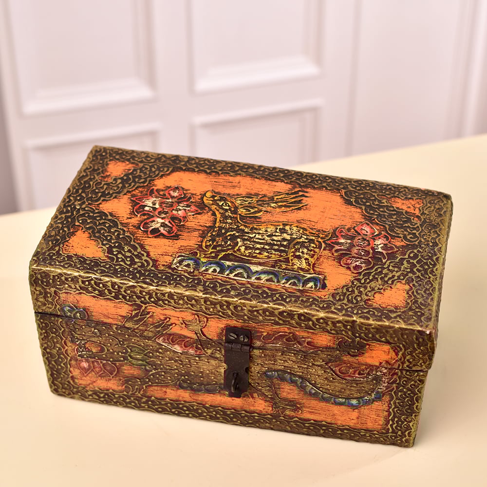 A rectangular wooden box which is a testament to the skill and creativity of Indian artisans. Handmade with precision and care, this exquisite box is a fusion of elegance and functionality. Crafted from high-quality wood, it boasts a remarkable multi-colour finish that accentuates its aesthetic appeal. The enchanting dragon and intricate designs, delicately engraved onto the box, tell stories of ancient legends and traditions. The latch adds a touch of security and charm to this extraordinary piece. This versatile box can be utilized as a jewelry box, safeguarding your precious ornaments and trinkets. Alternatively, it can store various small items, keeping your essentials organized and accessible. Its aesthetic charm is not limited to your personal space, it's perfect for display at exhibitions, where it's sure to captivate onlookers with its detailed artwork. Moreover, as a thoughtful gift, this handmade wooden box makes any special or festive occasion even more memorable.