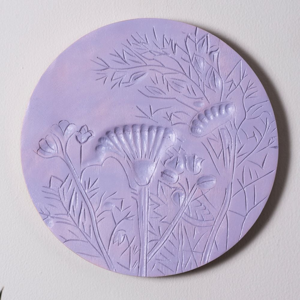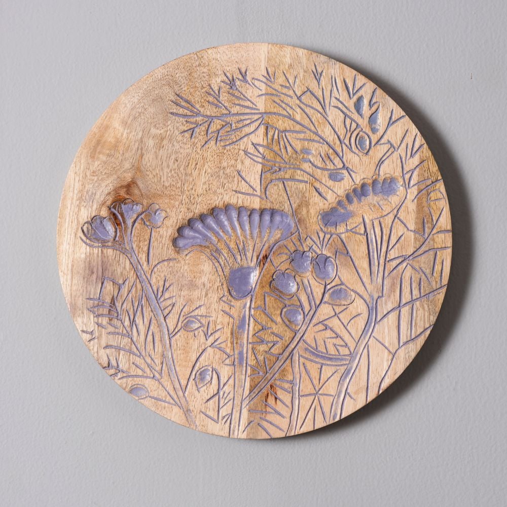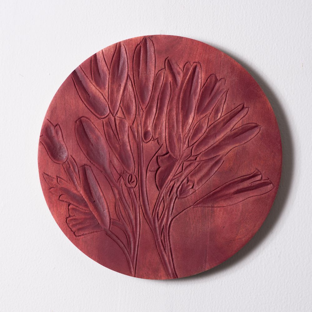 Each plate is a one-of-a-kind artwork that captures the beauty of floral patterns with carved precision and matte colors.