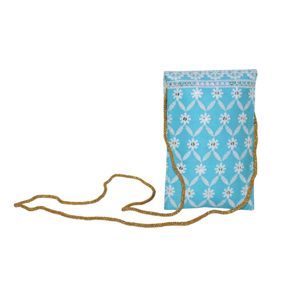 Bring a touch of charm and elegance to your ensemble with this stunning handmade cotton clutch, featuring intricate mirror work and delicate floral embroidery. The vibrant turquoise blue fabric is beautifully adorned with white floral designs, creating a fresh, eye-catching look. Perfect for casual events, weddings, or evening outings, this clutch combines beauty and functionality. The soft cotton material provides a comfortable feel, while the gold chain strap offers convenient, hands-free carrying. With its spacious interior, you can easily fit your essentials like phone, makeup, and cards. Handcrafted with precision, this unique accessory offers a timeless appeal with its modern yet traditional mirror work. Ideal for adding a pop of color and sparkle to any outfit, this clutch is a must-have for those who appreciate craftsmanship and elegance.