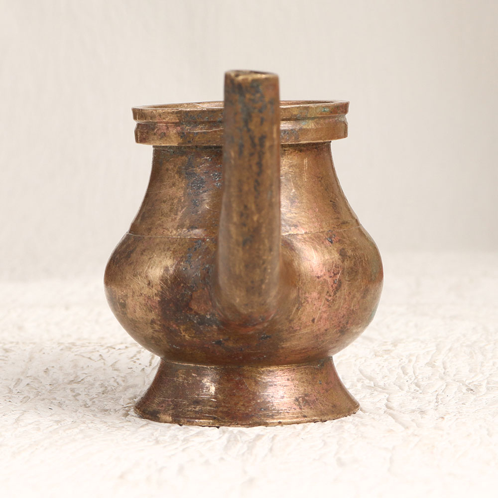 This small vintage brass holy water pot with a spout boasts an enchanting antique brown finish. Handcrafted by highly talented Indian artisans, this exquisite piece is a testament to their dedication and craftsmanship. Crafted from high-quality brass, this holy water pot is a work of art that can seamlessly blend into any setting. Whether you choose to place it in your home, office, restaurant, hotel, cafe, or shop, it serves as a captivating decoration piece, doubling as a unique flower pot with its spout adding a touch of whimsy to your floral arrangements. Steeped in tradition, this pot was originally used during prayer ceremonies to offer water to devotees, making it a symbol of reverence and spirituality. Now, it can find a new purpose in your vintage collection or be showcased in exhibitions, where its timeless beauty can be admired by all. Looking for a thoughtful gift? This brass holy water pot is an ideal choice for your loved ones on special, festive, or auspicious occasions. It embodies the rich heritage of Indian craftsmanship and spirituality, making it a meaningful and cherished present for any occasion.