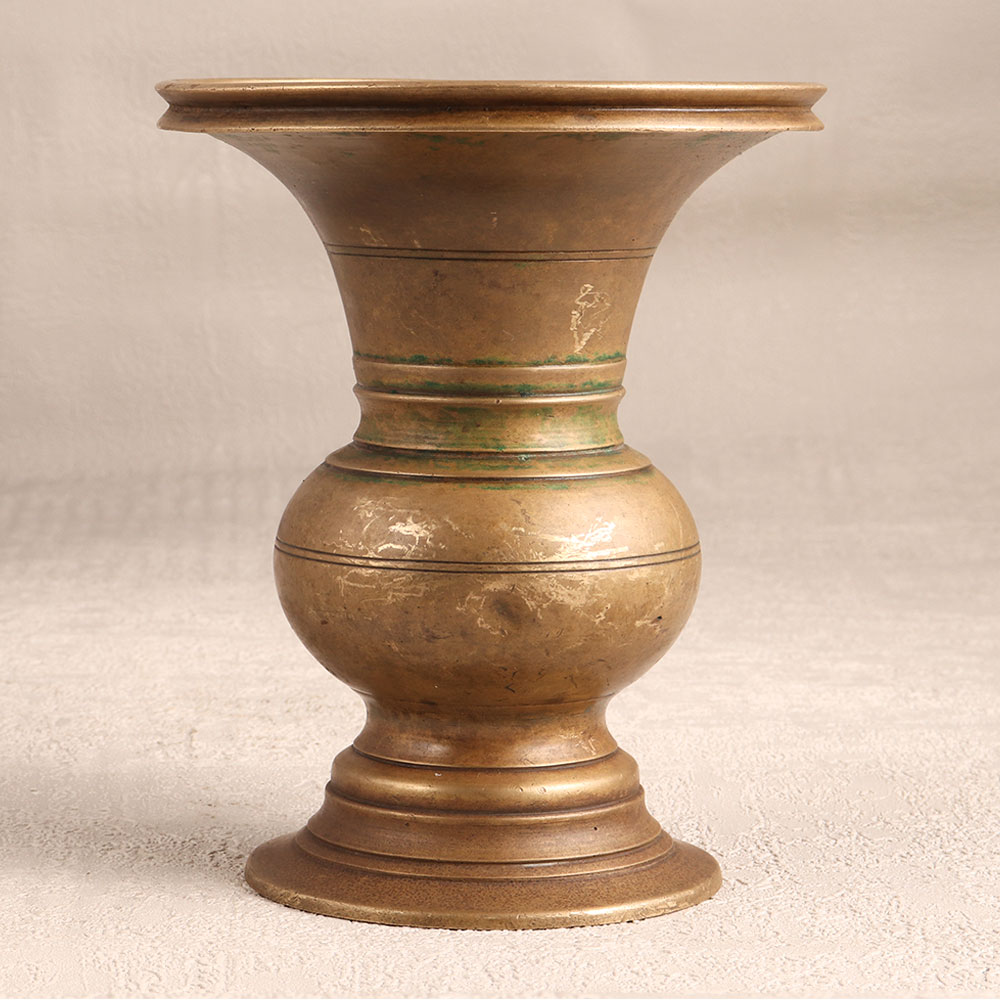 Adorn your interior with a touch of South Indian artistry and timeless elegance by adding this exquisite vintage brass holy pot to your collection. Meticulously handcrafted by highly skilled Indian artisans, this piece exudes the charm of traditional craftsmanship. Made from high-quality brass, the antique brown finish lends an air of sophistication, making it a versatile addition to your interior or exterior space. The intricately detailed design, inspired by South Indian art, captivates with its authenticity. This versatile piece serves as a flower pot, adding a unique element to your home, office, restaurant, hotel, or cafe decor. Its timeless appeal ensures it complements various design styles, from classic to contemporary. Beyond its decorative value, this holy pot can be a striking addition to your vintage collection or exhibition. It tells a story of India's rich cultural heritage and artisanal excellence. Moreover, it makes for a thoughtful gift on special, festive, or auspicious occasions, symbolizing blessings, tradition, and craftsmanship – a truly remarkable token of appreciation for your loved ones.