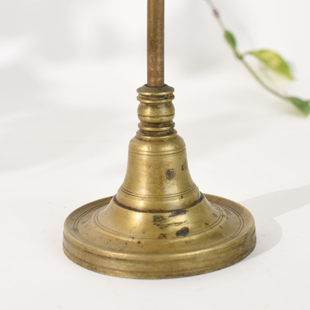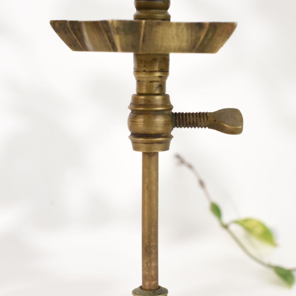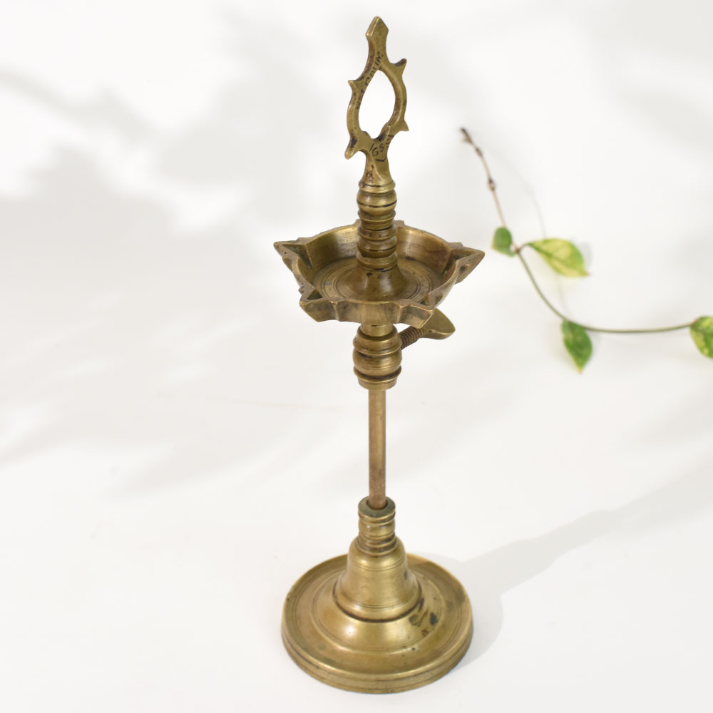 This vintage brass oil lamp stand is a timeless representation of South Indian ritual artistry. Designed with a tall slender column, flared circular base, and a beautifully carved floral oil dish, it reflects the classical craftsmanship passed down through traditional metalworkers of Tamil Nadu and Karnataka. The ornate openwork finial at the top adds a spiritual aura, while the adjustable screw detail enhances its authenticity, showcasing its original functional purpose in ceremonial lighting. Its naturally aged brass surface reveals a warm golden patina, making every piece visually unique and rich in history. Whether displayed in a pooja room, placed on an altar, or styled as a heritage decor accent, this lamp instantly adds a sense of culture, warmth, and divine symbolism to your home. Perfect for collectors, decorators, spiritual homes, or anyone who values artisanal brassware, this lamp stand doubles as a decorative treasure and a meaningful cultural artefact.