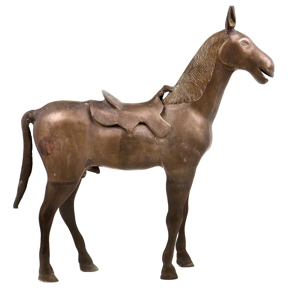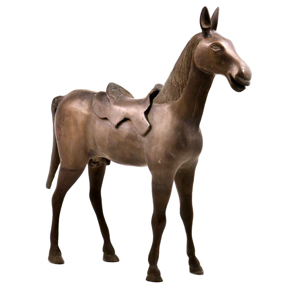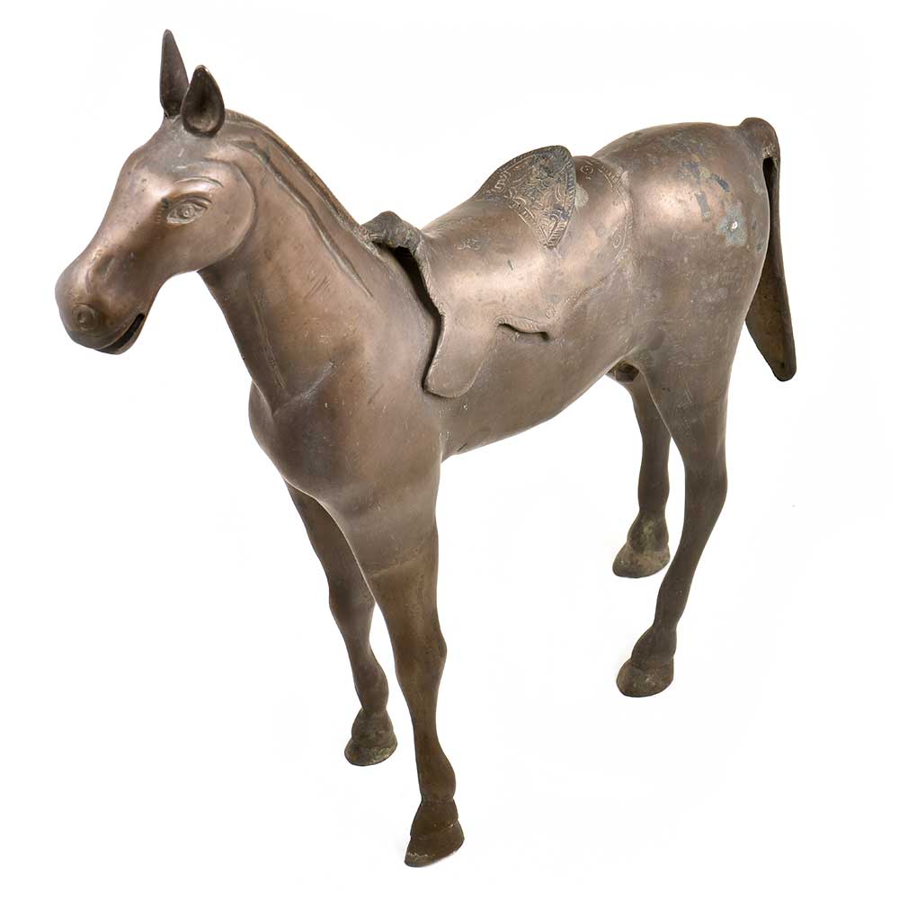 Handcrafted to perfection this elegant standing Horse statue in solid brass is an ideal showpiece for the living room, gifting it to your friends and relatives during festivals and also act as a souvenir. The beauty of the Horse lies in the detailed carving and the green patina that gives it a classy vintage look.