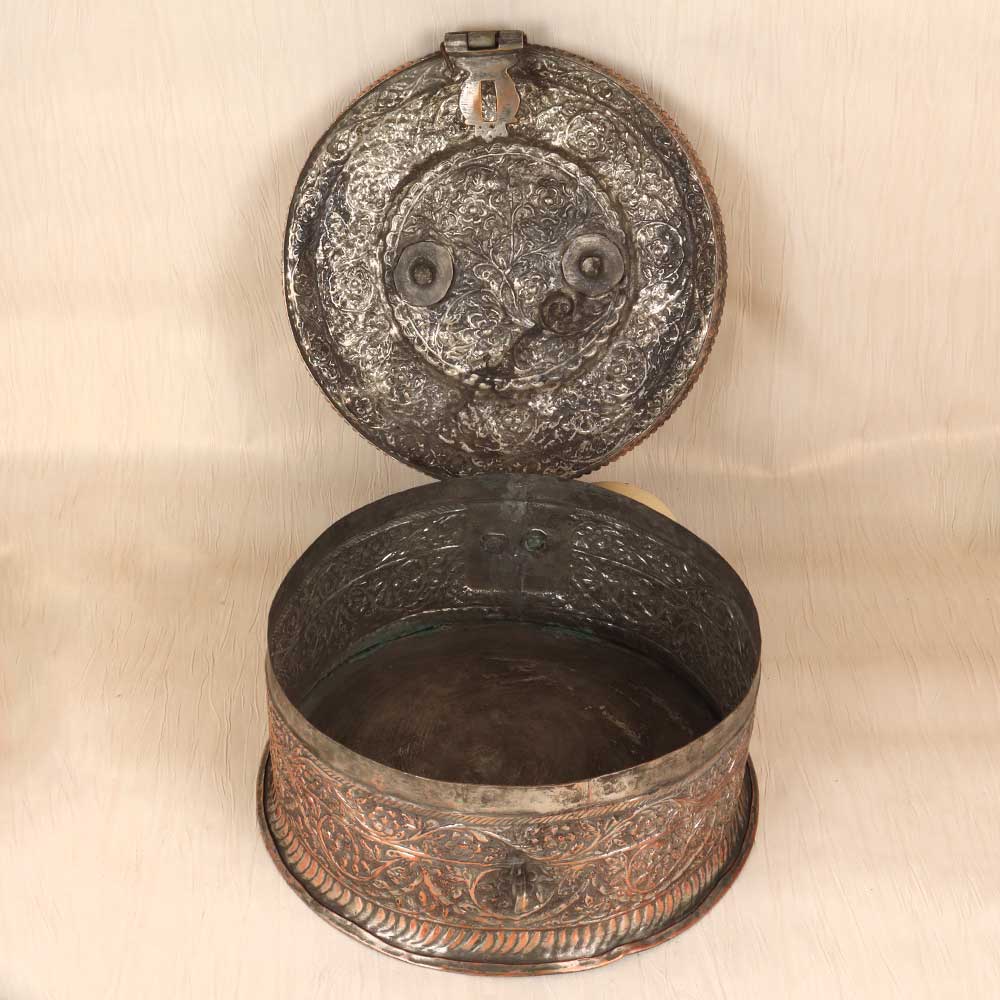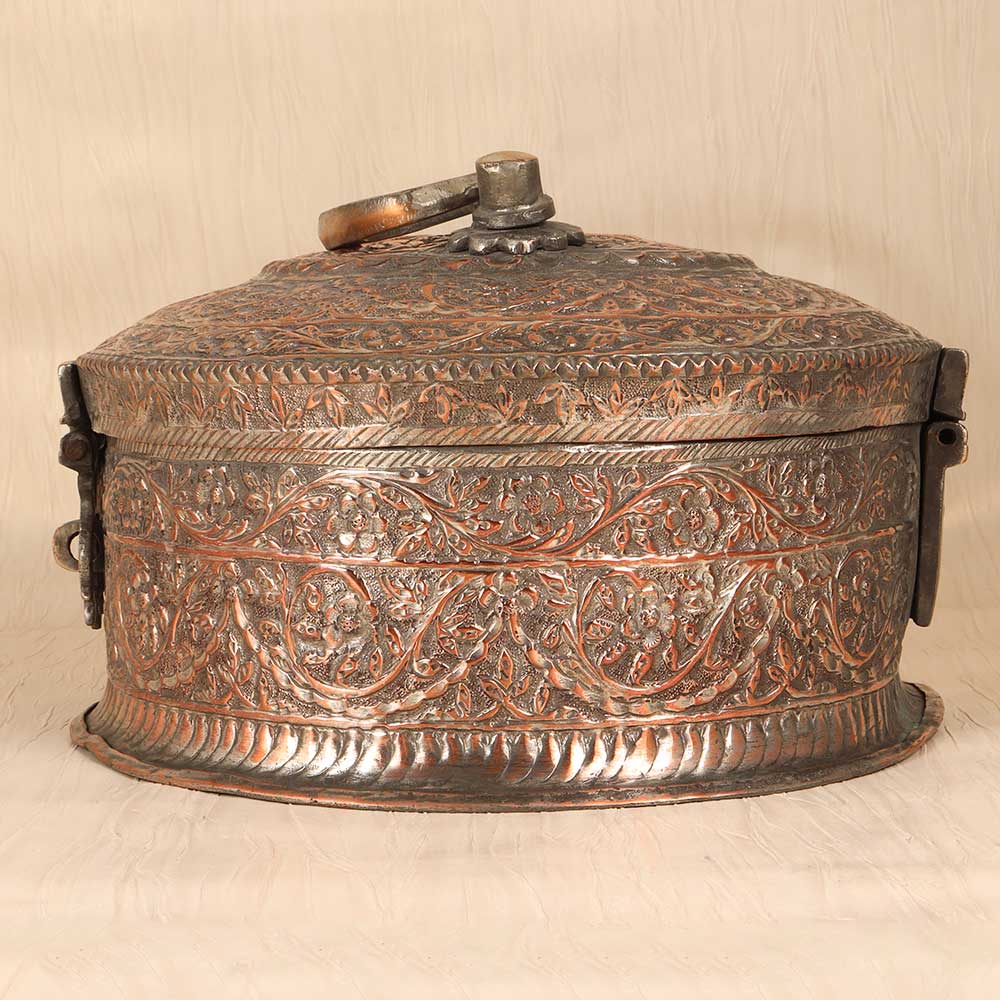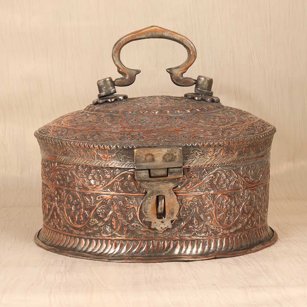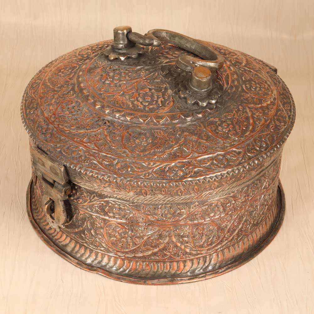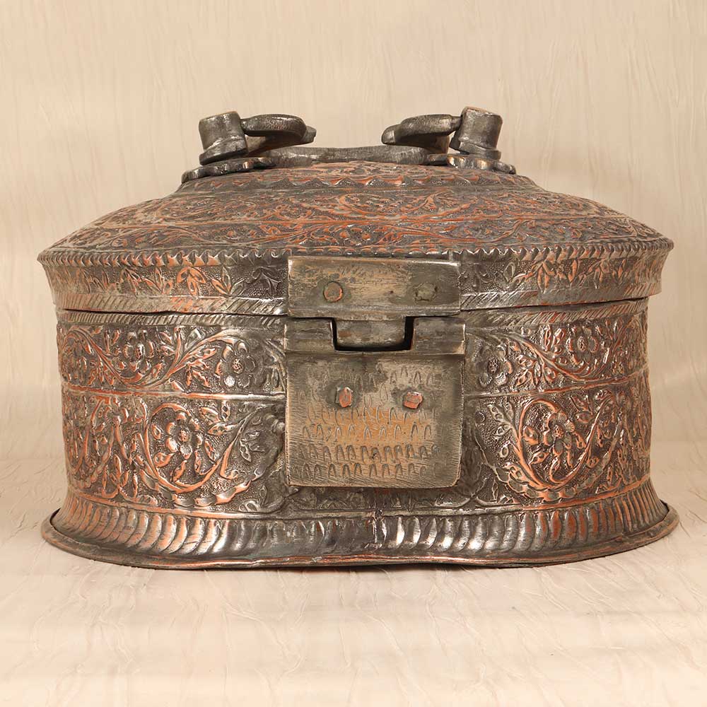 A piece of art for your valuables! This gorgeous vintage copper jewelry box is a treasure itself, featuring intricate Islamic motifs engraved into the rich copper metal. With its antique patina, floral and geometric designs, and Middle Eastern inspiration, this jewelry box adds an exotic elegance to any dresser or nightstand. The engraved patterns dance across the lid and sides of the box, with delicate swirls and starbursts accentuating the vintage warmth of the copper. Inside, the box contains ring rolls and compartments to organize all your special pieces. Sturdy yet elegant, this jewelry box lets you safely store your jewelry while bringing artistic flair to your room. For collectors of Islamic art and artifacts, this jewelry box is a must-have decorative piece. The engraved motifs connect you to ancient traditions of metalworking and design. For anyone wanting to add a touch of worldly, vintage beauty to their bedroom decor, this copper jewelry box is an eye-catching treasure. Display your jewelry in style and keep your valuables safe within an ornate work of art.