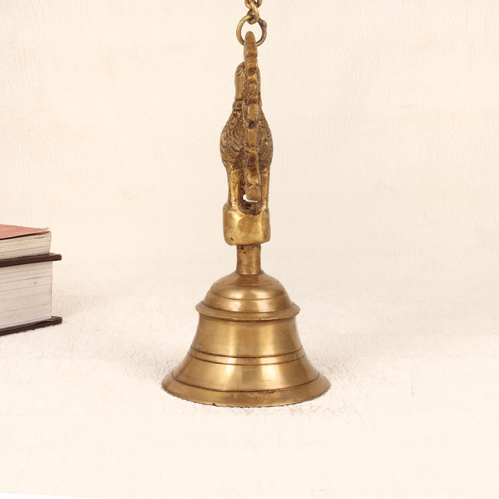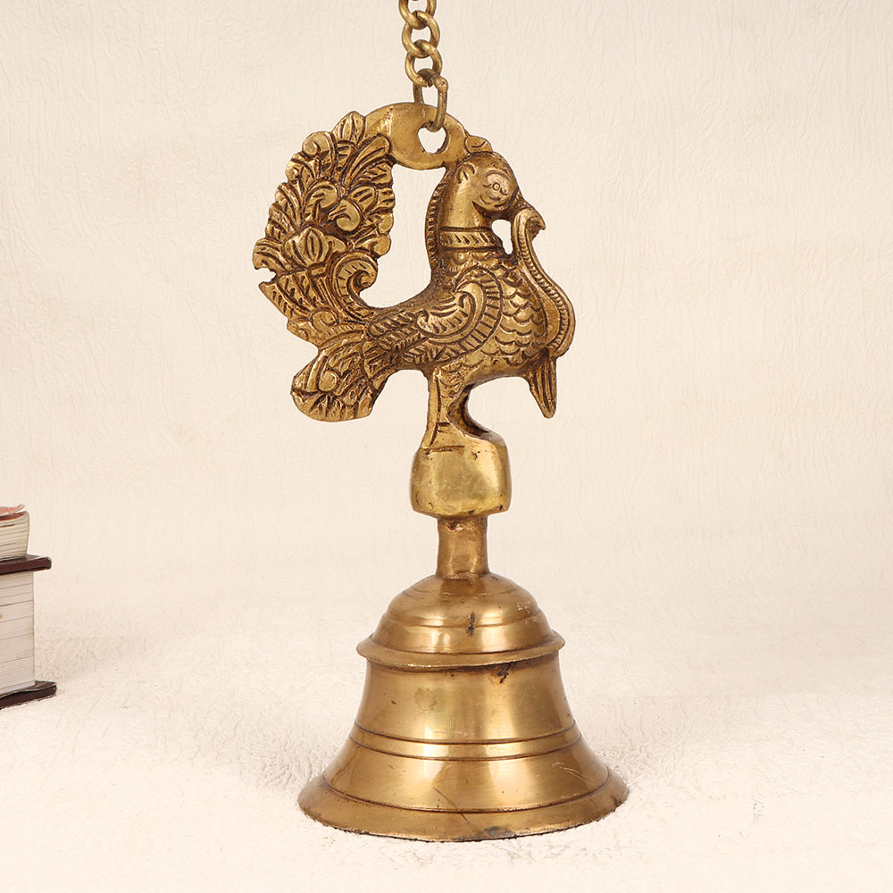 This Vintage Bell Metal Hanging Temple Bell adorned with a majestic peacock carving atop is meticulously handcrafted by highly talented Indian artisans hailing from Central India. Crafted from high-quality bell metal, this exquisite bell captures the essence of traditional craftsmanship, offering a nostalgic touch with its antique brown finish. Ideal for adorning temples or prayer rooms, this bell comes complete with a chain for easy hanging, creating an ambience of serenity and spirituality. Beyond religious spaces, this versatile piece seamlessly complements various settings such as homes, offices, restaurants, hotels, or cafes. Its aesthetic allure extends beyond functional use, making it a splendid decorative item that effortlessly blends into any vintage-themed collection. The bell serves as an eloquent gift choice for loved ones during special, festive, or auspicious occasions, embodying the richness of Indian heritage and artistry. Each ring resonates with the history and craftsmanship passed down through generations, offering a unique blend of cultural significance and timeless beauty.