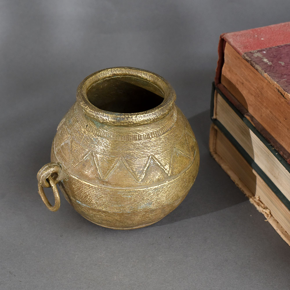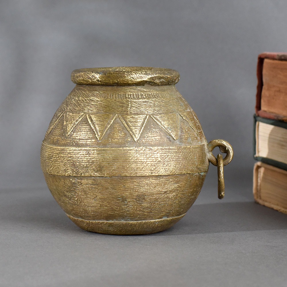 Infuse your space with cultural depth using this handcrafted brass measuring pot from Odisha. Traditionally used for measuring grains in Indian village kitchens, this pot is both functional and artistic. It features engraved zigzag patterns around the body, symbolizing tribal design influences, and includes a side loop with a movable brass ring—once used for hanging or easy handling. Its rich, earthy brass finish and textural surface make it an excellent choice for rustic décor, cultural displays, or spiritual corners. This piece beautifully bridges tradition and timeless design.