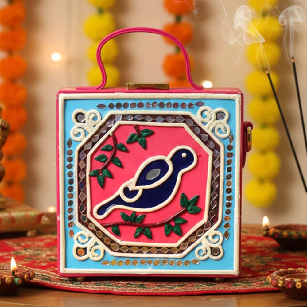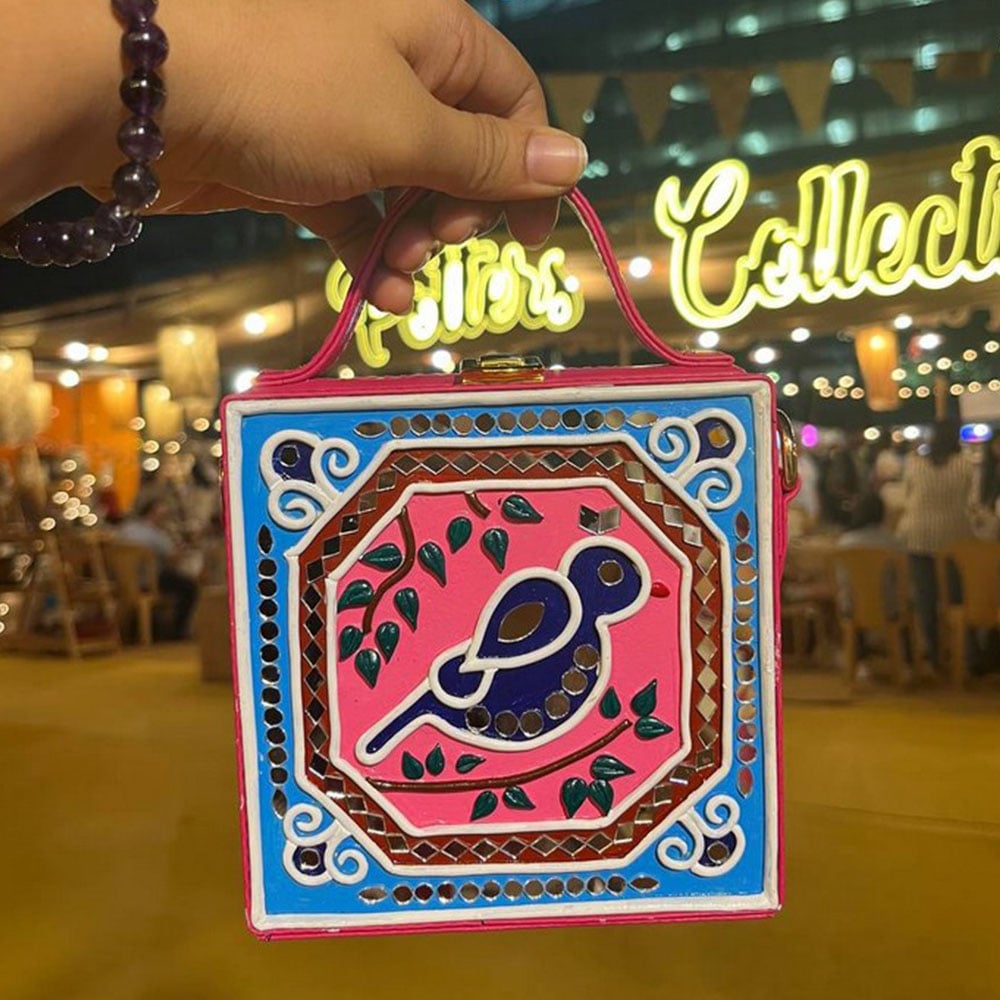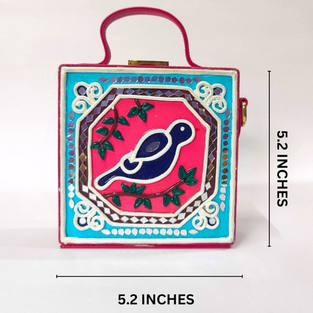This mini sling box bag showcases bird inspired Lippan art that blends tradition with modern style. Its compact box form and mirrored details make it appealing to collectors decorators and gifters alike. Each piece is handcrafted by skilled artisans and packed and quality checked by Indianshelf.