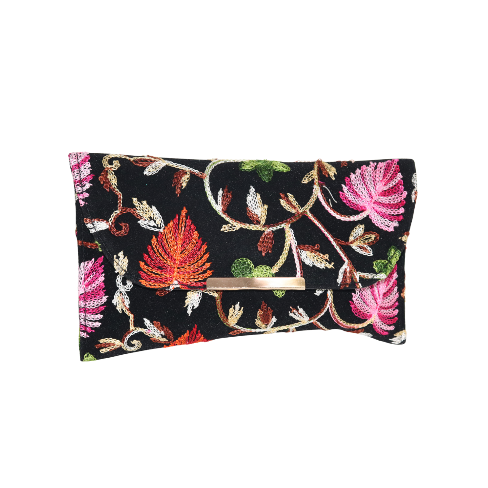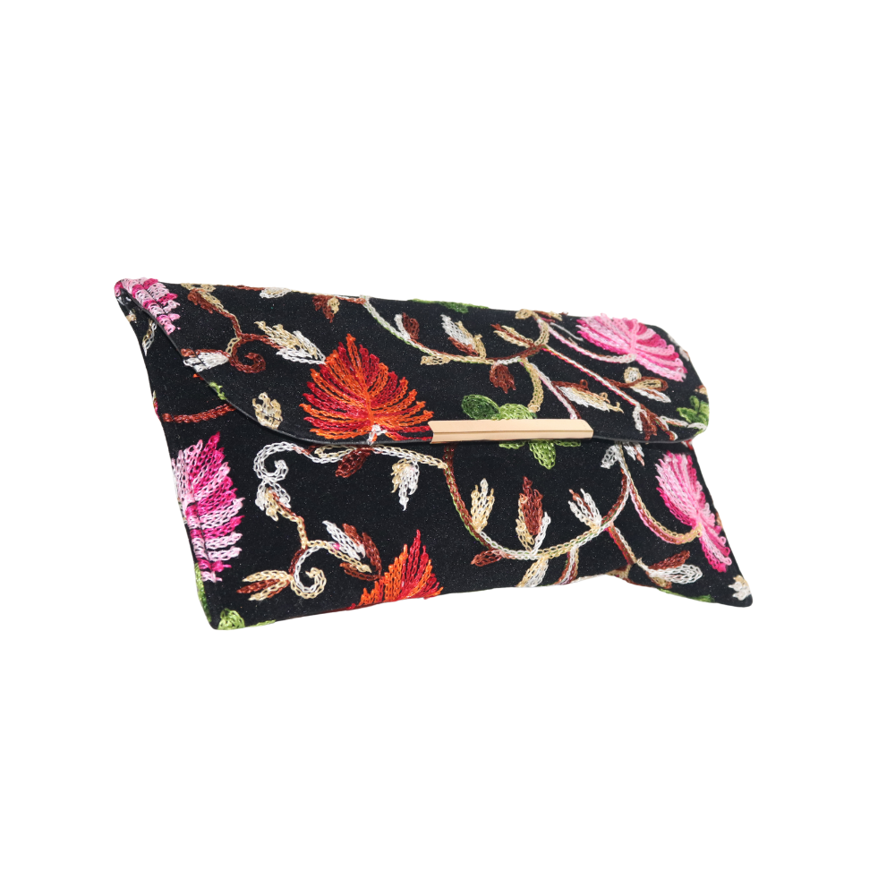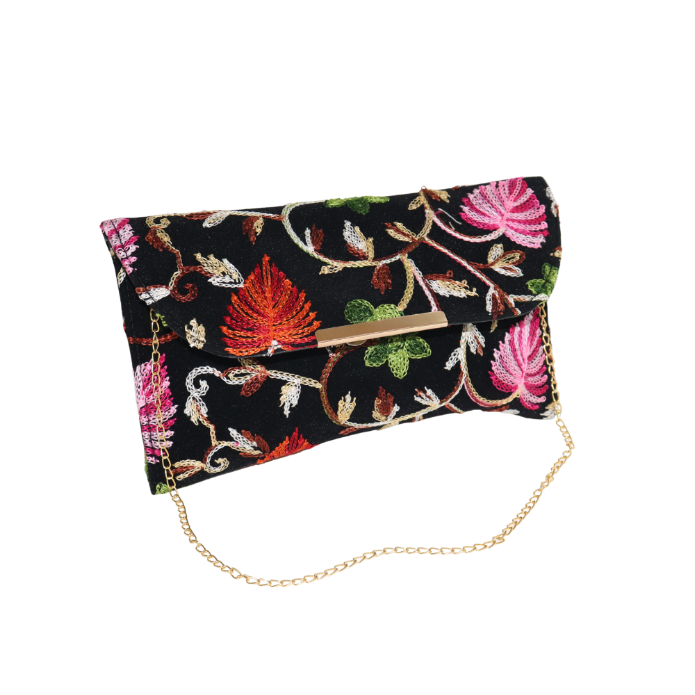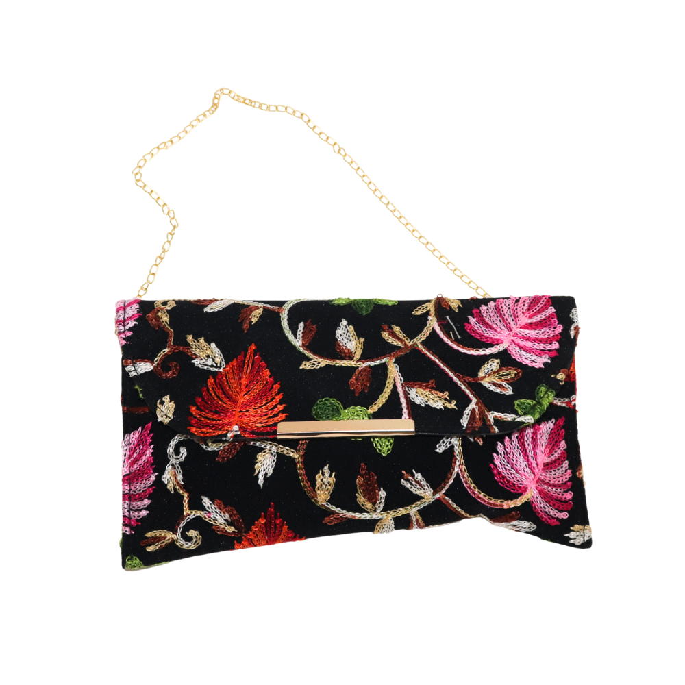 Make a bold statement with this vibrant handmade velvet clutch, adorned with intricate, colorful beadwork. The rich black velvet background perfectly contrasts with the bright, floral embroidery in shades of pink, orange, and green, creating a truly eye-catching accessory. Whether you're heading to a wedding, party, or a special night out, this clutch is the perfect addition to any outfit. The delicate gold chain strap allows for easy, hands-free carrying, while the compact interior offers ample space for your essentials like a phone, cards, and makeup. This beautifully handcrafted clutch is designed to elevate your style with its unique floral patterns and luxurious velvet fabric. With attention to detail and fine craftsmanship, it’s an accessory that will complement any formal or casual look.