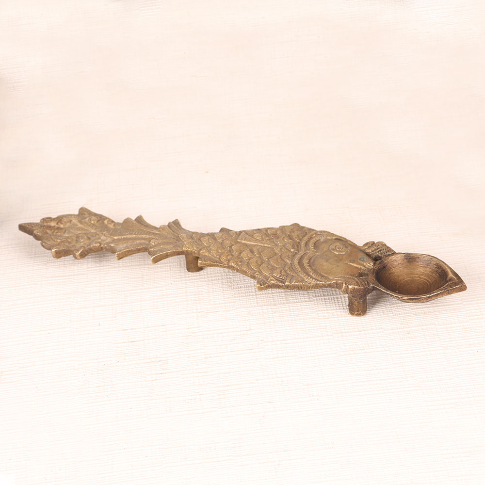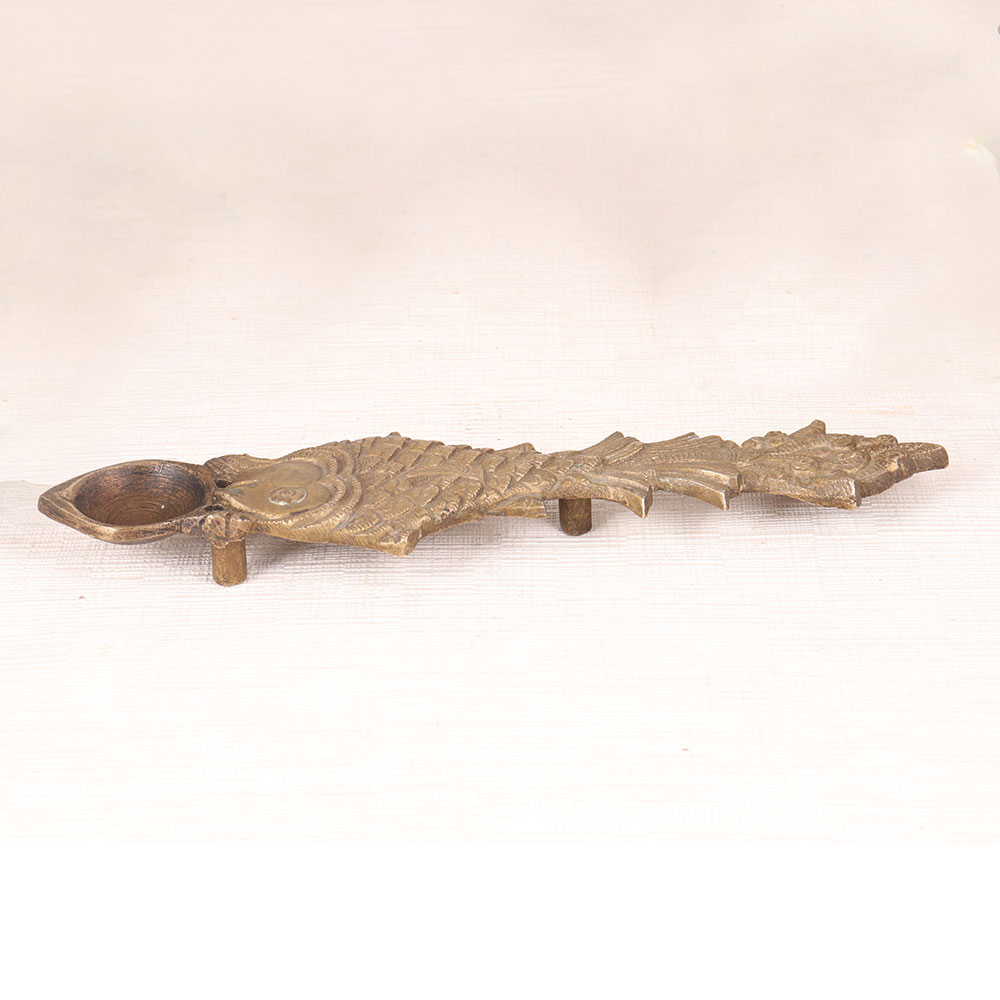 This Vintage Brass Aarti Lamp with a gracefully elongated fish handle is lovingly handcrafted by talented Indian artisans hailing from the heart of Western India. This magnificent piece is adorned in an antique brown finish and is a testament to the artistry and heritage of our ancestors. Meticulously crafted from high-quality brass, this Aarti lamp is a versatile addition to your living spaces. Whether it graces your home, office, restaurant, hotel, shop, or cafe, it brings an air of timeless elegance. Its primary purpose, however, is to illuminate your prayer room during morning and evening rituals, infusing your sacred moments with a warm, golden glow. Perfect for vintage enthusiasts and ideal for exhibitions, this Aarti lamp tells a story of tradition and craftsmanship. Fill it with the fragrant glow of mustard oil or ghee, ignite the cotton wicks, and let its radiance envelop your surroundings. As a thoughtful gift, it symbolizes blessings and good wishes.
