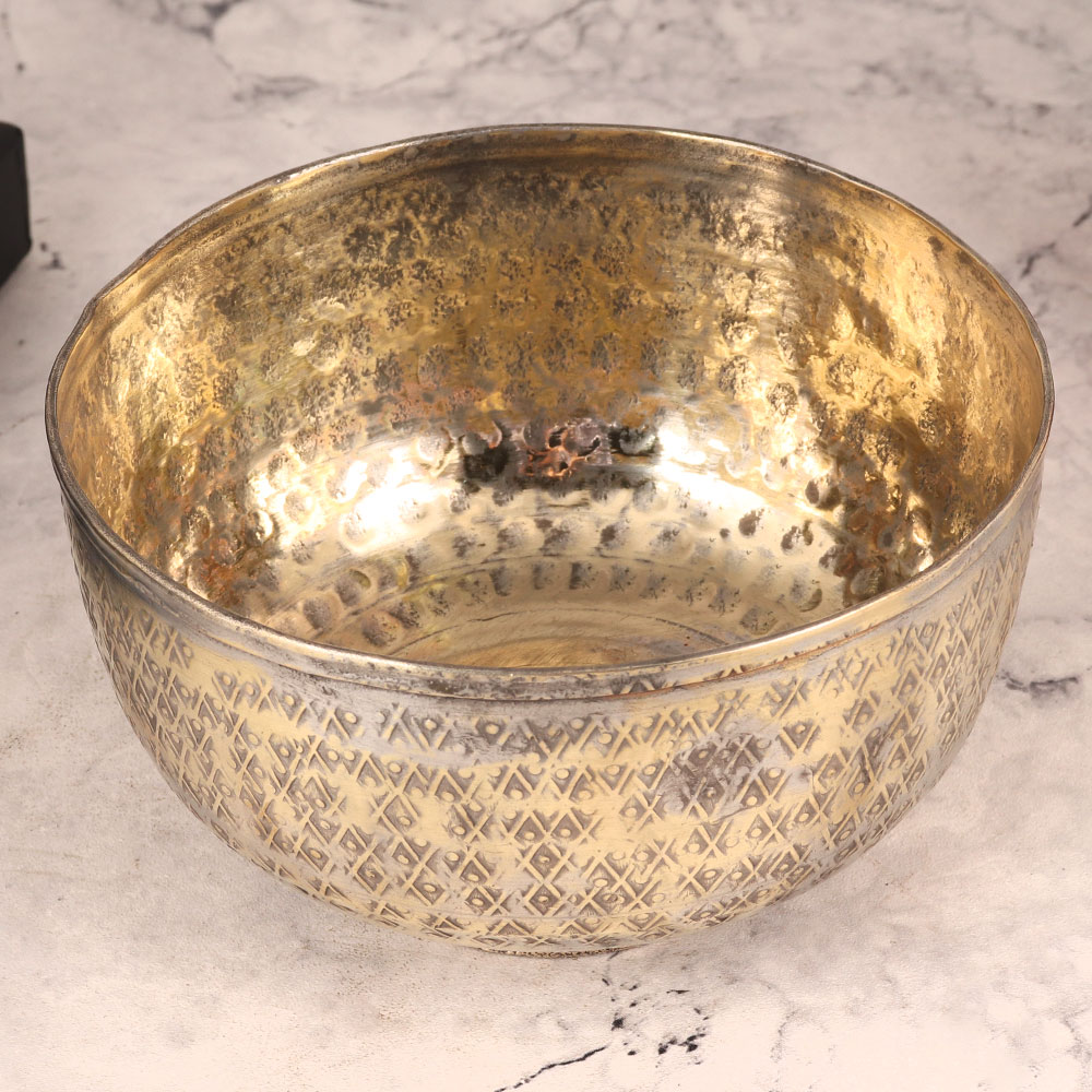 Elegance meets history in this exquisite vintage brass bowl, a true testament to the artistry of highly skilled artisans from the realm of Islamic Art. Crafted with precision from high-quality brass, this masterpiece boasts an antique golden finish that evokes the opulence of a bygone era. Its surface is adorned with intricate, timeless engravings that narrate stories of a rich cultural heritage. Originally intended to serve food, it now beckons as a stunning decorative piece, echoing the grandeur of yesteryears. Whether it graces your home, office, restaurant, hotel, shop, or cafe, this ornate brass bowl transforms any space into a realm of vintage charm. Collectors with an affinity for the past will find it a cherished addition to their trove. Display it proudly at exhibitions, allowing its beauty to captivate all who behold it. For those who appreciate the fusion of history and aesthetics, this bowl makes a perfect gift for loved ones on special, festive, or auspicious occasions, a symbol of enduring beauty that transcends time.