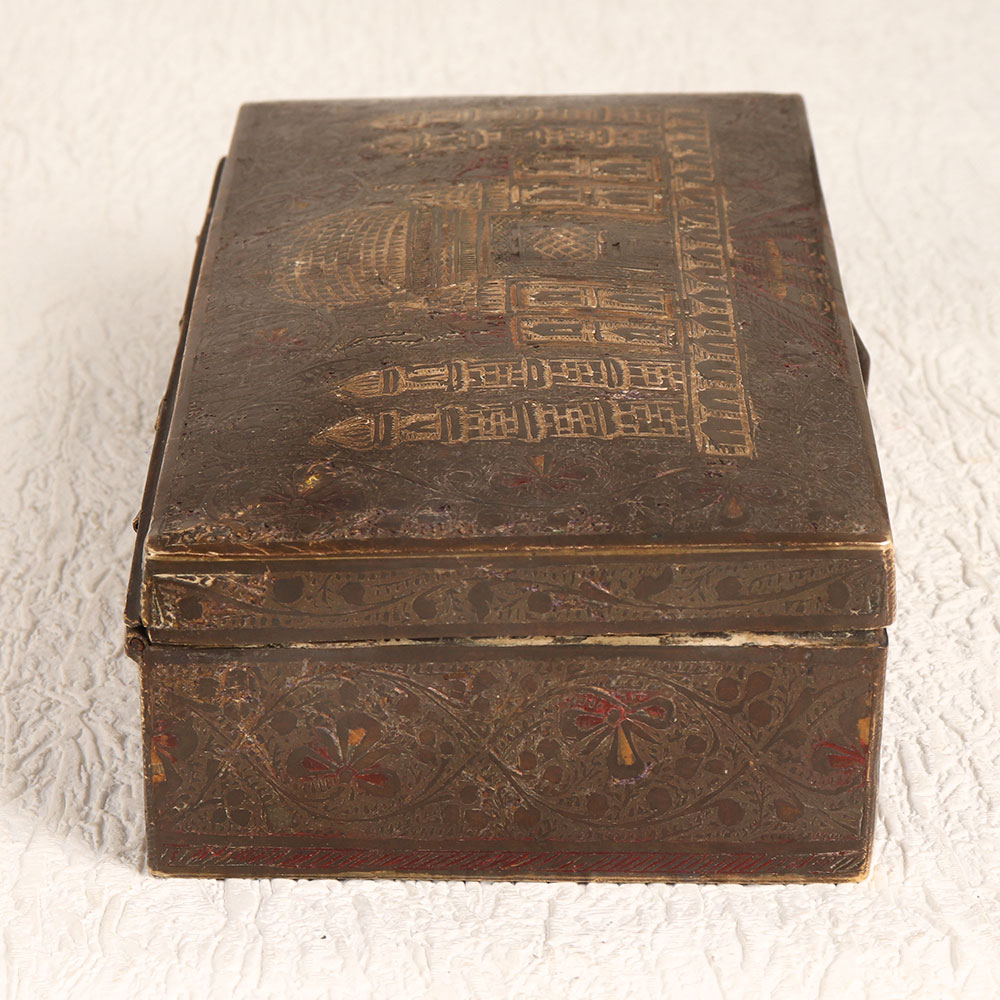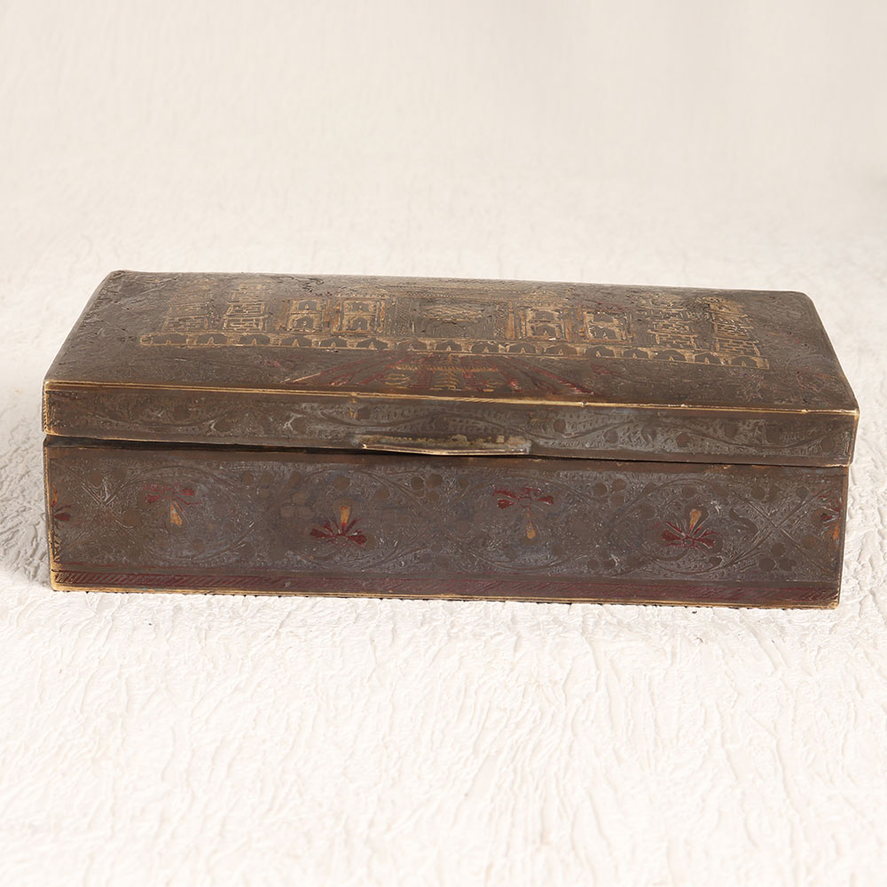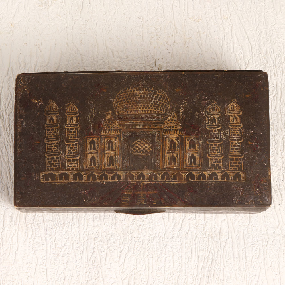 Enhance your interior decor with the timeless charm of this exquisite vintage brass box featuring the iconic Taj Mahal engraved on its lid. Handcrafted by highly skilled and experienced artisans from the cultural heartland of Hyderabad, India, this box showcases the rich craftsmanship that has been passed down through generations. The antique brown finish adds an aura of nostalgia and sophistication, making it a versatile addition to any setting. Whether you want to enhance the ambiance of your home, office, restaurant, hotel, cafe, or shop, this brass box is the perfect choice. It exudes an old-world charm that complements both contemporary and traditional interiors. Crafted from high-quality brass, this box is not only a beautiful piece of art but also a sturdy and functional storage option. Its ornate design and historical significance make it an excellent addition to vintage collections and exhibition displays. Additionally, it makes for a thoughtful and meaningful gift for your loved ones on special, festive, or auspicious occasions.