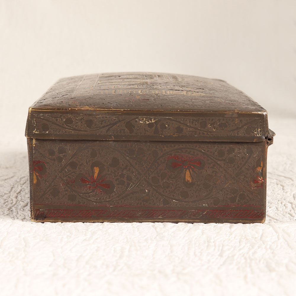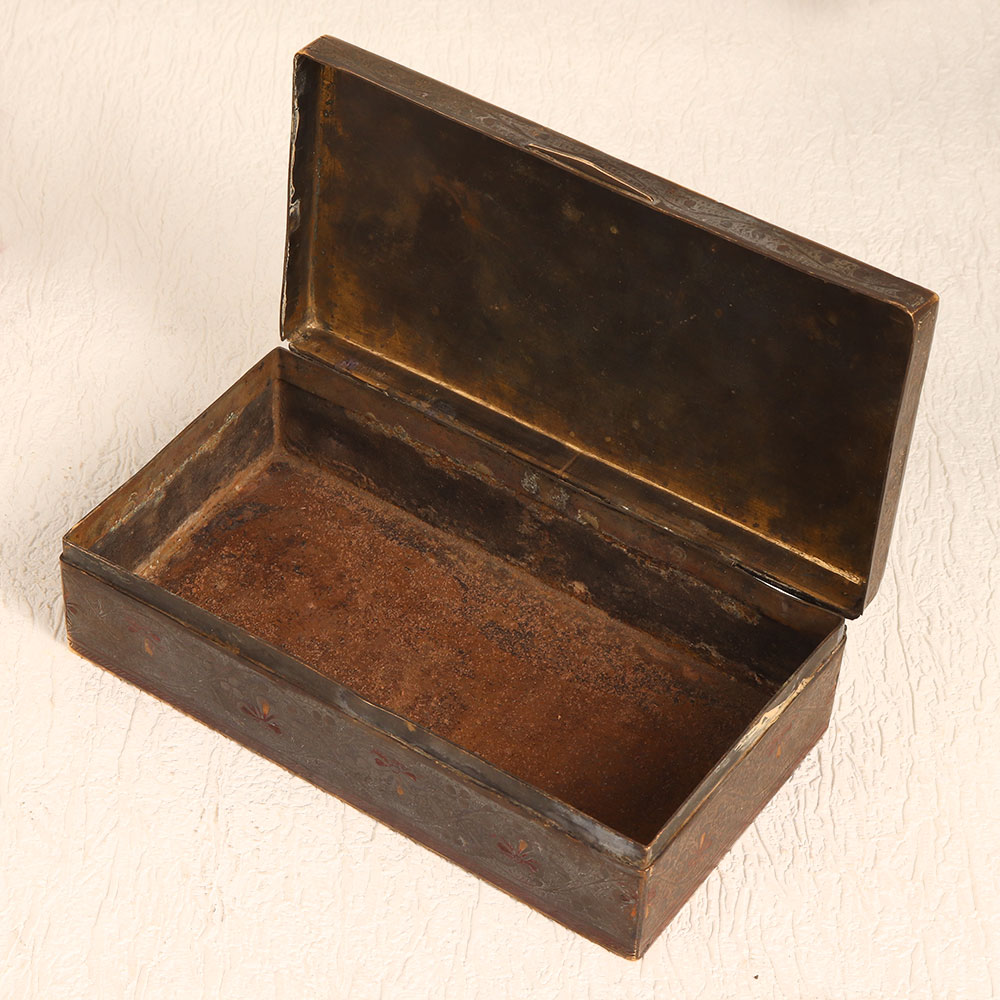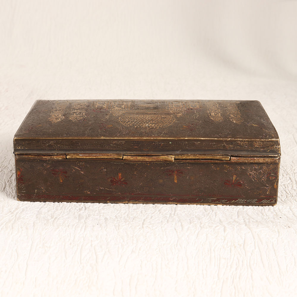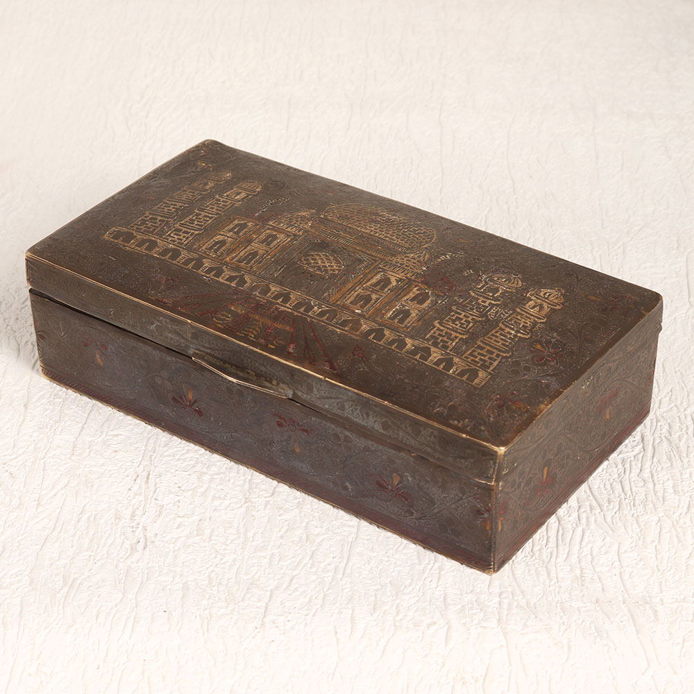 Enhance your interior decor with the timeless charm of this exquisite vintage brass box featuring the iconic Taj Mahal engraved on its lid. Handcrafted by highly skilled and experienced artisans from the cultural heartland of Hyderabad, India, this box showcases the rich craftsmanship that has been passed down through generations. The antique brown finish adds an aura of nostalgia and sophistication, making it a versatile addition to any setting. Whether you want to enhance the ambiance of your home, office, restaurant, hotel, cafe, or shop, this brass box is the perfect choice. It exudes an old-world charm that complements both contemporary and traditional interiors. Crafted from high-quality brass, this box is not only a beautiful piece of art but also a sturdy and functional storage option. Its ornate design and historical significance make it an excellent addition to vintage collections and exhibition displays. Additionally, it makes for a thoughtful and meaningful gift for your loved ones on special, festive, or auspicious occasions.