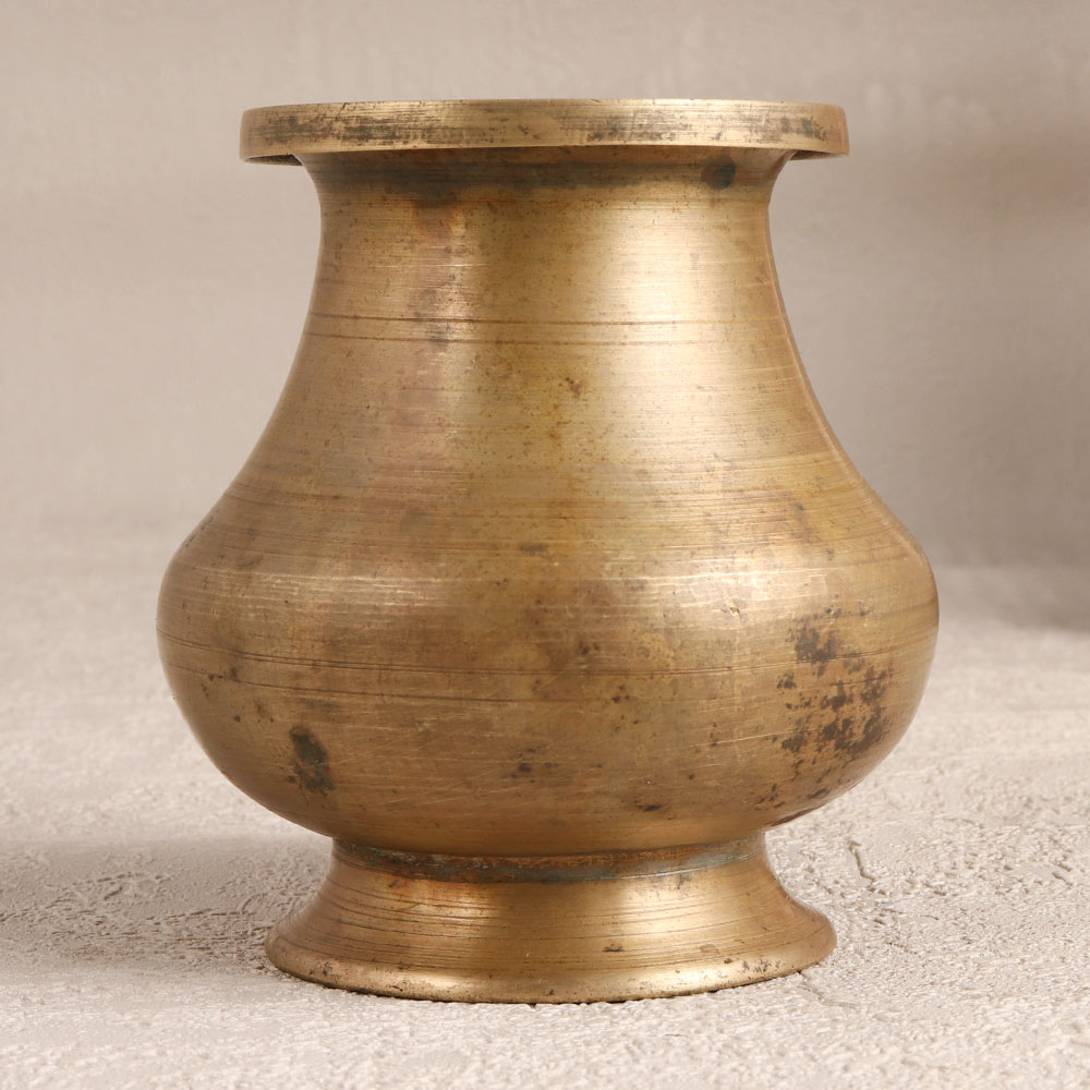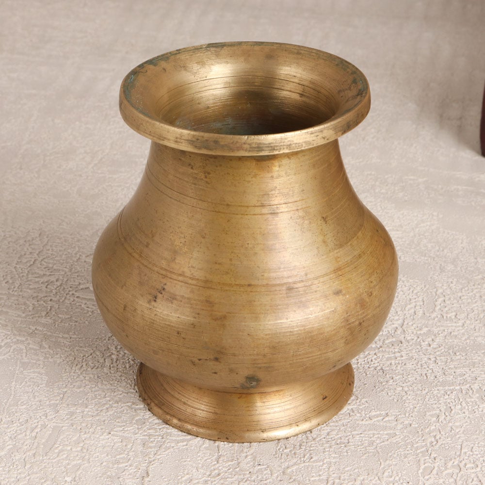 Imbued with spiritual significance and crafted with meticulous artistry, this vintage brass holy water pot is a testament to South Indian craftsmanship. Its timeless design, featuring an antique brown finish, resonates with the rich traditions of prayer, havan, and rituals. Handmade by talented Indian artisans from high-quality brass, this versatile pot serves a dual purpose - holding sacred water during prayers and doubling as an exquisite flower pot. The pot's aesthetic allure extends to its utility at temples, where it becomes an offering vessel for water to Sun God and the Shivling. This artefact is not confined to sacred spaces, it seamlessly integrates into homes, offices, restaurants, hotels, or cafes, adding a touch of divine elegance. Beyond its functional attributes, this pot makes for an exceptional decor piece or a valuable addition to a vintage collection. As a thoughtful gesture, it can be bestowed upon loved ones during special, festive, or auspicious occasions.