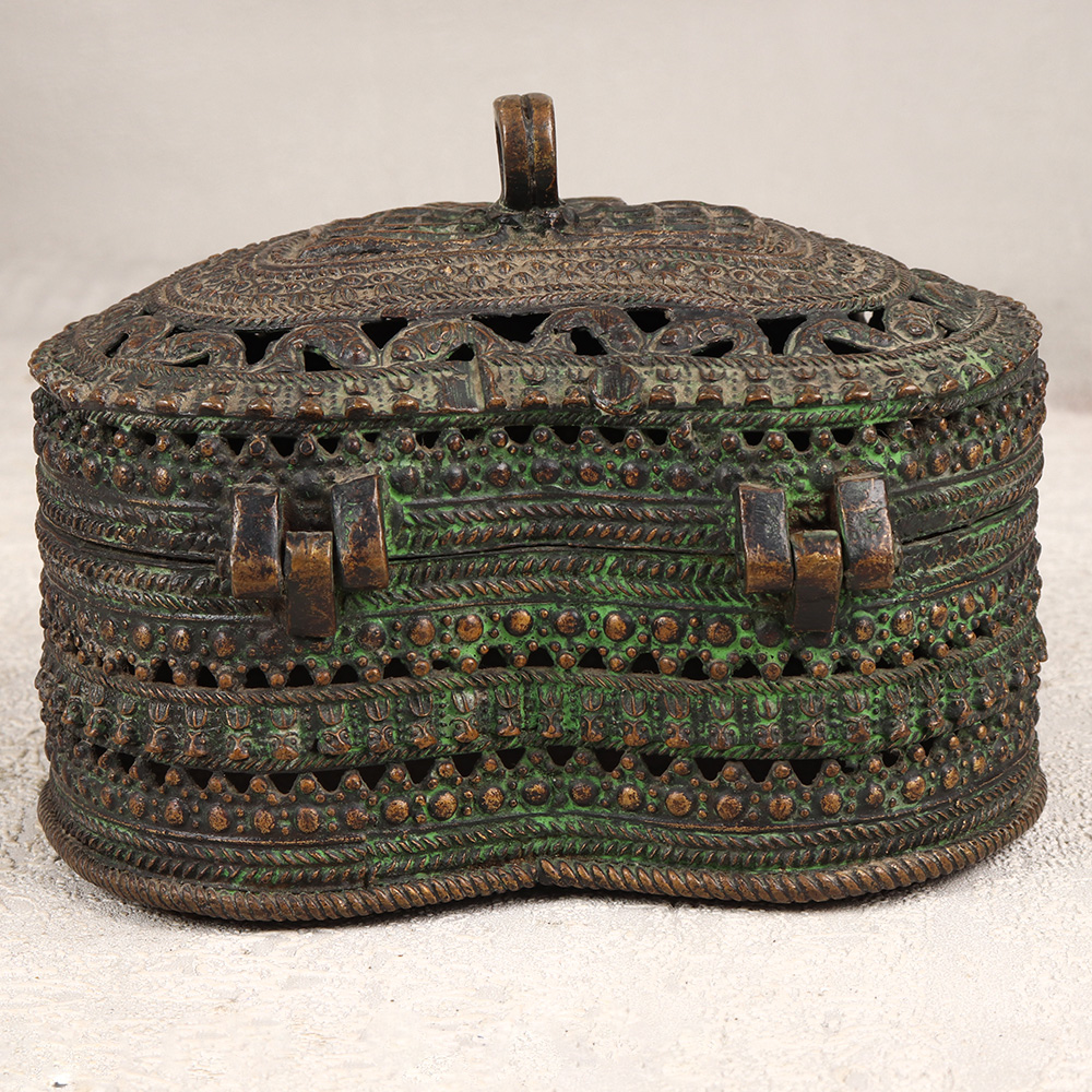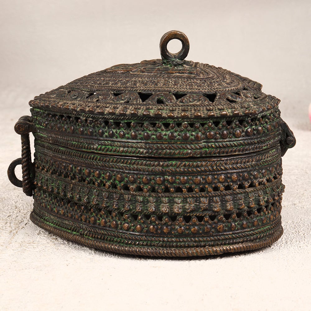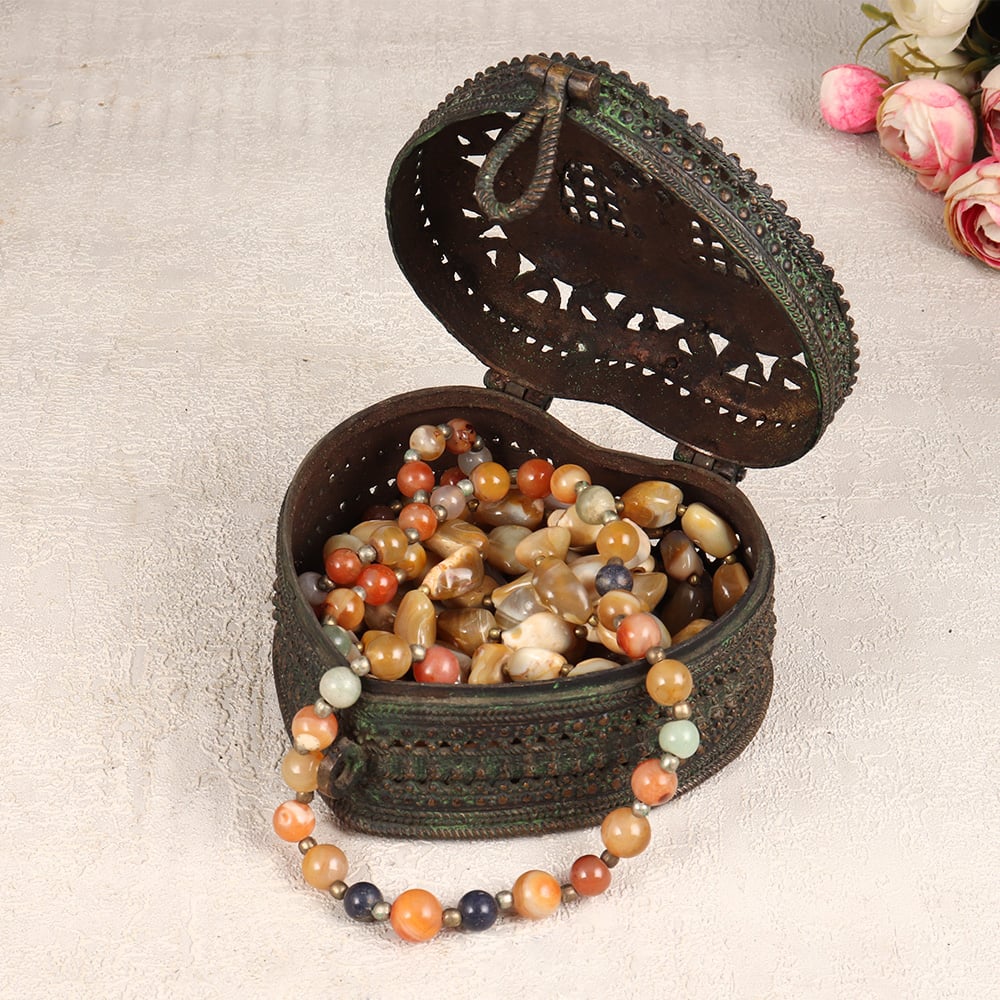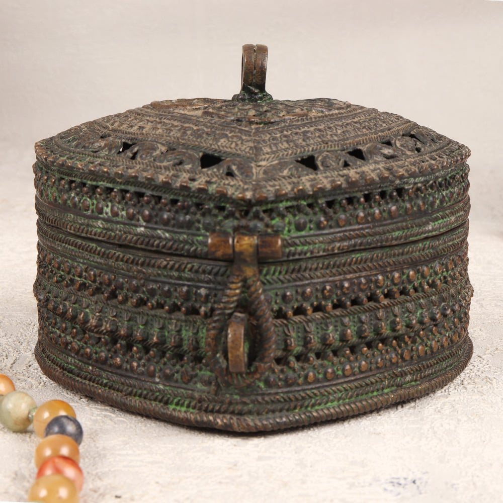 Decorate your interior with our exquisite Vintage Brass Heart-Shaped Jewelry Box that is a testament to the artistry of professional Indian artisans in Odisha. Crafted with precision and passion, this enchanting piece features intricate jali work and captivating engravings on high-quality brass, showcasing the rich heritage of Odisha Art. The heart shape adds a touch of romance, while the antique dark finish lends a timeless allure. This jewelry box comes complete with a secure latch, ensuring the safety of your precious stones and jewelry. Its handmade nature makes each piece unique, embodying the craftsmanship of the artisans who pour their expertise into every detail. Versatile in its application, this jewelry box seamlessly fits into any setting – be it at home, office, restaurant, hotel, or cafe – adding a touch of vintage charm to your space. Ideal for both decoration and functionality, it serves as a perfect addition to any vintage collection. Moreover, it makes for an exceptional gift for your loved ones on special, festive, or auspicious occasions.